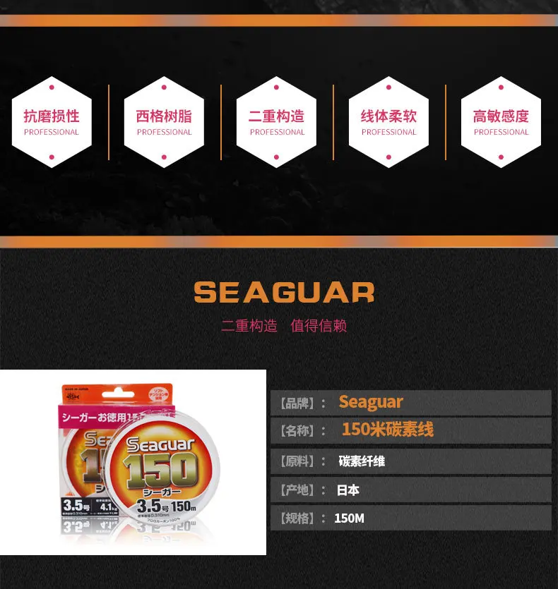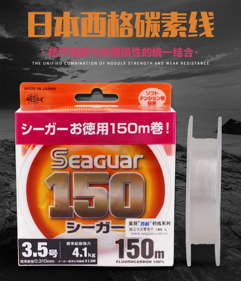 100% Original Japan Seaguar 150M Fluorocarbon Fishing Line 1.35-9.6 Kg Drag Fluorocarbon Carbon Bass Carp Leader LineHigh-capacity economical type of high quality fluorocarbon line "Seager". While maintaining the same quality of the seagull, the conventional 130m roll was increased by 20m. The low water absorption of fluorocarbon prevents the strength from deteriorating when used for a long time. A new soft tension winding has been adopted.