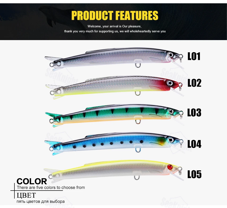 Características:1. Ganchos: anticorrosión, mayor potencia, duradero, agua de mar de agua dulce universal.2.Piel de pez de simulación (laser): el diseño de la piel de pez de simulación la hace más atractiva para los peces grandes.3.Bolas de metal: bolas de acero inoxidable en el interior, para mantener el equilibrio del señuelo de pesca, para lanzar a distancia más lejana.4.Anillos bicíclicos más fuertes: fortalecen el doble círculo y aumentan la resistencia al tirón.Ojos de pez 5.3D: ojos de simulación 3D, grandes y brillantes, más tentadores y reflectantes.6.Embalaje del producto: Cada cebo está empaquetado en una bonita caja de PVC al por menor.Detalles del producto:Marca: SeaKnightModelo de señuelo: Minnow SK005Tipo de señuelo: señuelo de pesca duroPeso del señuelo: 13 g/0,46 ozLongitud del señuelo: 110 mm/4,33 pulgadasProfundidad de buceo: 0,3-0,9 M/0,98-2,95 piesFlotabilidad: señuelo flotanteGanchos: equipados con 2 ganchos afilados.Ojos: ojos de pez 3DAnillos: Biíclicos5 colores: L01,L02,L03,L04,L05Embalaje:Peso del artículo: 25 gPeso del paquete: 42 gEl paquete incluye: 1 unidad * señuelo de pesca (puede elegir colores: L01/L02/L03/L04/L05)