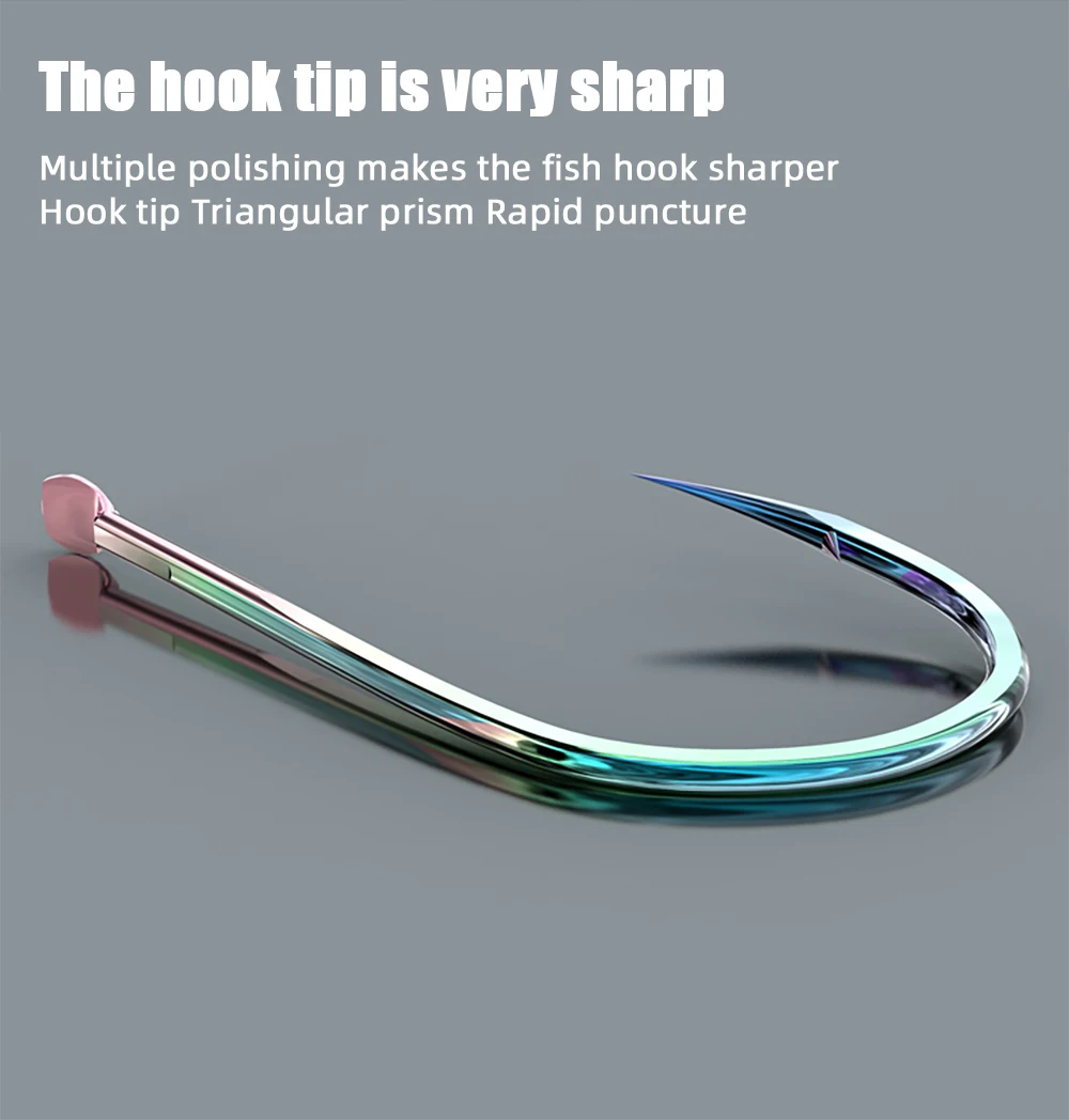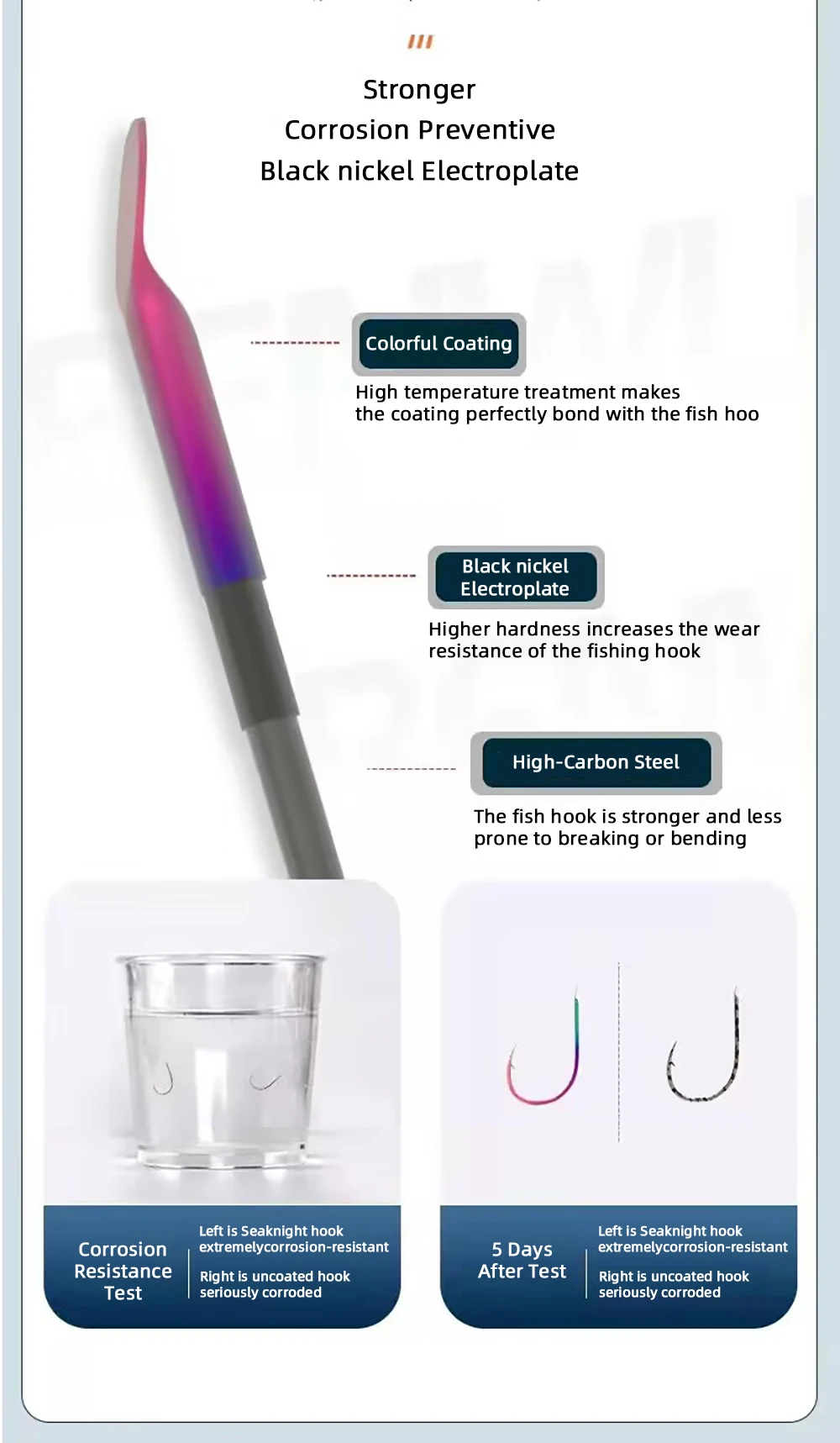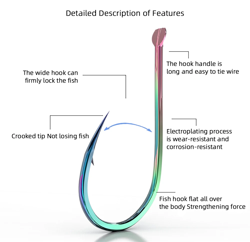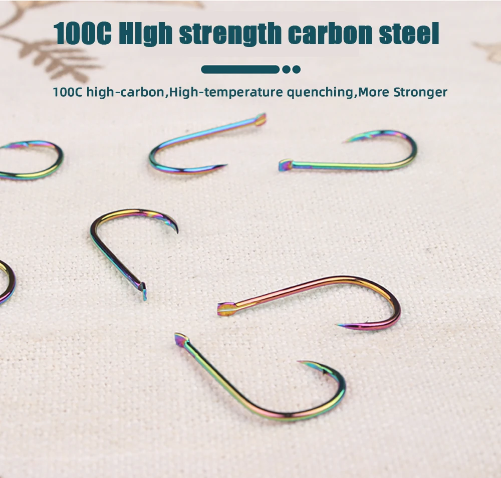 1: Gancho de púas. Este anzuelo tiene púas que pueden atrapar peces fácilmente, no es fácil escapar de los peces.Acero 2Hgh-carbono. Este material de gancho es acero de alto carbono, no se rompe ni se deforma fácilmente.
