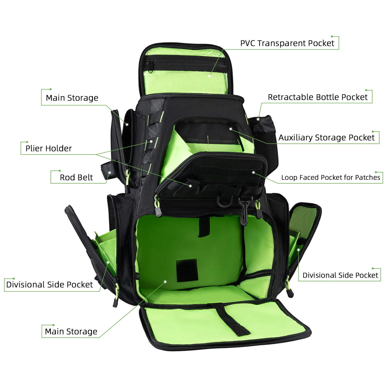 01: Una bolsa de almacenamiento de pesca profesional y un diseño de gran capacidad que almacena fácilmente carretes de pesca y otros aparejos de pesca.