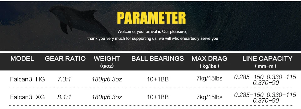 FALCANIII XG | Relación de transmisión: 8,1: 1 | Peso: 180g | Rodamientos: 11BB | Arrastre máximo: 7KG | Capacidad de Línea: 0.285mm-150m 0.330mm-115m 0.370mm-90m