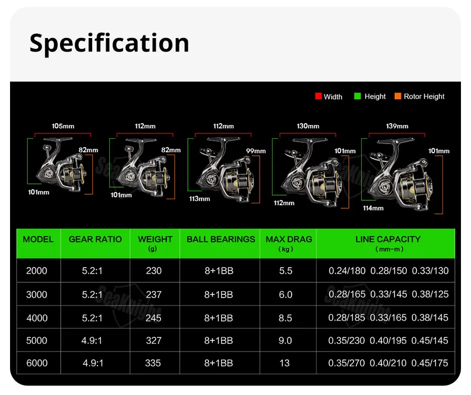 2000 | Gear Ratio: 5.2:1 |Bearings: 10BB | Max Drag: 5.5KG | Line Capacity: 0.24-180 0.28-150 0.33-130