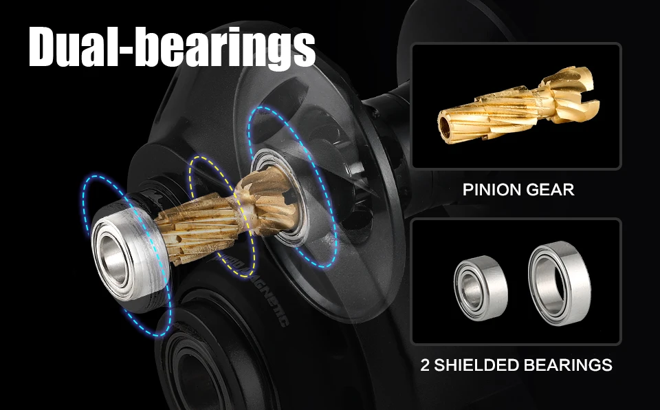 El Sistema de engranajes de doble rodamiento ofrece un carrete más ligero y fuerte contra cargas pesadas de hasta 18 libras, mejora la eficiencia de los engranajes, una fundición más larga sin ruido.