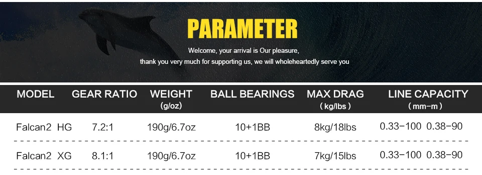 FALCON/FALCAN2 XG | Relación de engranaje: 8,1: 1 | Peso: 190g | Rodamientos: 11BB | Arrastre máximo: 7KG | Capacidad de Línea: 0,33mm-100M