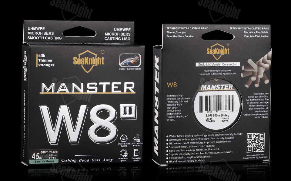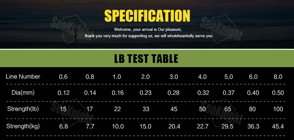 SEAKNIGHT ULTRA CASTING BRAIDMás delgado, más fuerte, más suave, más duraderoExtremadamente alta resistencia por diámetro.Increíble resistencia y durabilidad de alto recuento, delgada y sensible.Resiste "cavar" en el carrete.1, tecnología avanzada de gran angular: la súper línea suave.2, solidez del color mejorada.3, Fundición larga y rápida: más suave que nunca4, Súper sensibilidad: sensación instantánea de estructura y golpes5, fuerza y dureza excepcionales6, colores de alta visibilidad y baja visibilidad todos disponiblesDetalles del producto:Marca: SeaKnightModelo: Línea trenzada Monster W8 150MMetros: 150MForma: NivelMaterial: alambre trenzadoFlotabilidad: flotante7 colores:Verde de alta visibilidad, verde de baja visibilidad, gris de baja visibilidad, amarillo de alta visibilidad, azul, negro, MuNúmero de línea: 0,6;0,8;1.0;2.0;3.0;4.0;5.0;6.0;8,0.******Este enlace es Manster/Monster W8 II 150M. Si necesita 300M, 500M, visite mi tienda ******Lista de paquetes:1 hilo de pescar de 150M.Nota: El número de línea no es el diámetro, consulte la tabla cuidadosamente y déjenos un mensaje si hay algo confundido, ¡gracias!!