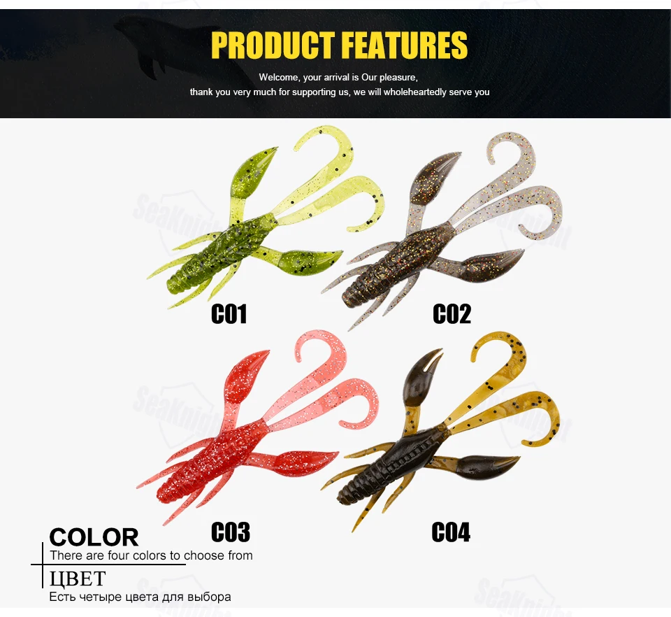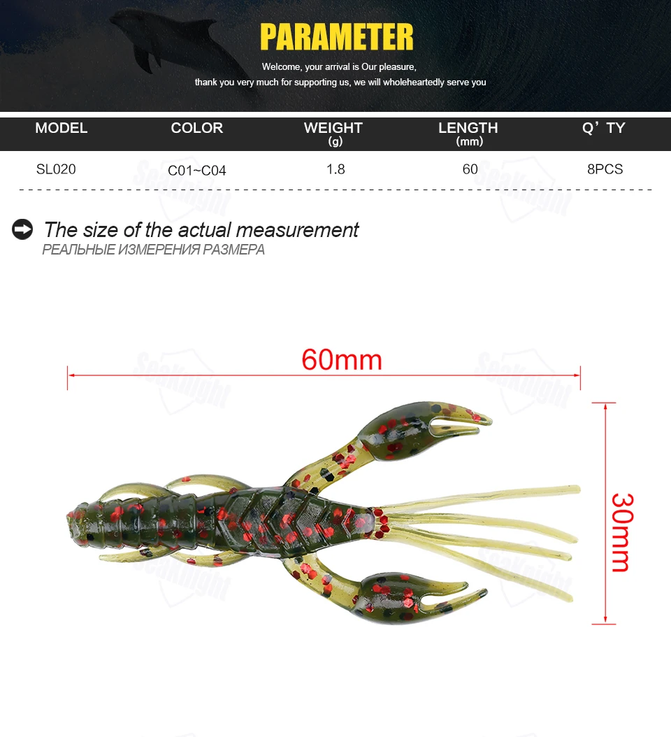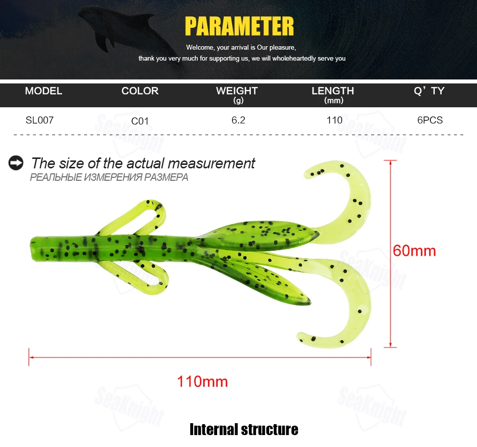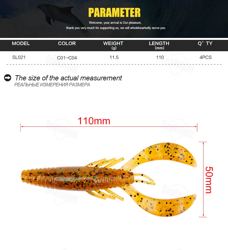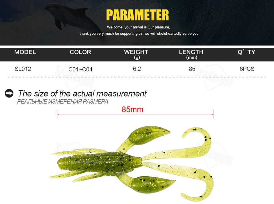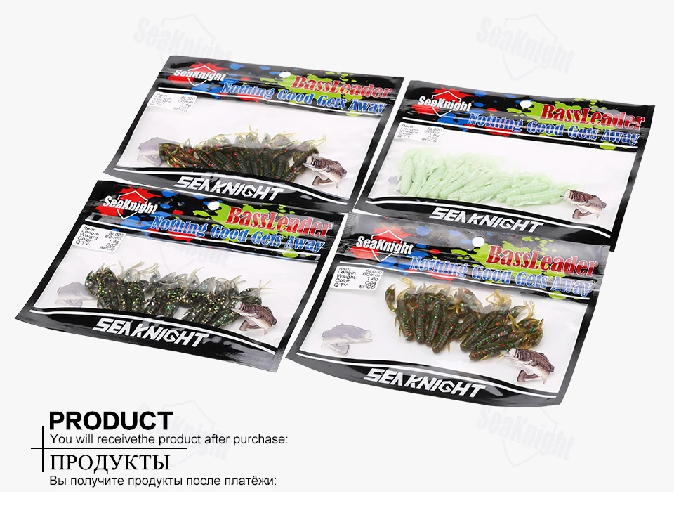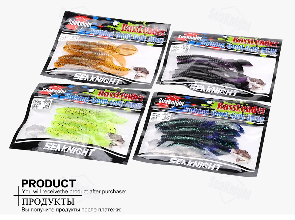 SeaKnight Brand Soft Lure Soft Fishing Lures Carp Fishing Lures 1.8g 6.2g 10g 11.5g Saltwater/Freshwater Fishing 1Bag/LotSL007 | Weight: 6.2g | Length: 110mm | Colors: C01 | Quantity: 6Pcs/Lot (6Pcs each bag) SL012 | Weight: 6.2g | Length: 85mm | Colors: C01,C02,C03,C04 | Quantity: 6Pcs/Lot (6Pcs each bag) SL019 | Weight: 10g | Length: 101mm | Colors: C01,C02,C03,C04 | Quantity: 6Pcs/Lot (6Pcs each bag) SL020 | Weight: 1.8g | Length: 60mm | Colors: C01,C02,C03,C04 | Quantity: 8Pcs/Lot (8Pcs each bag) SL021 | Weight: 11.5g | Length: 110mm | Colors: C01,C02,C03,C04 | Quantity: 4Pcs/Lot (4Pcs each bag)