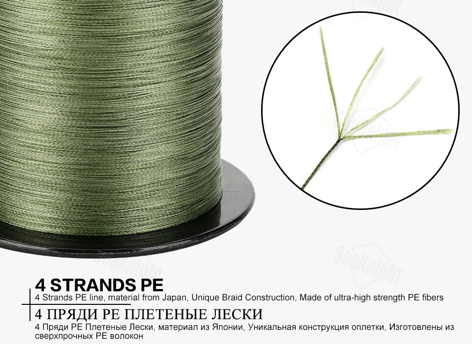 1, línea de 4 PE filamentos, material de Japón, construcción de trenza única, hecha de fibras PE de ultra alta resistencia.