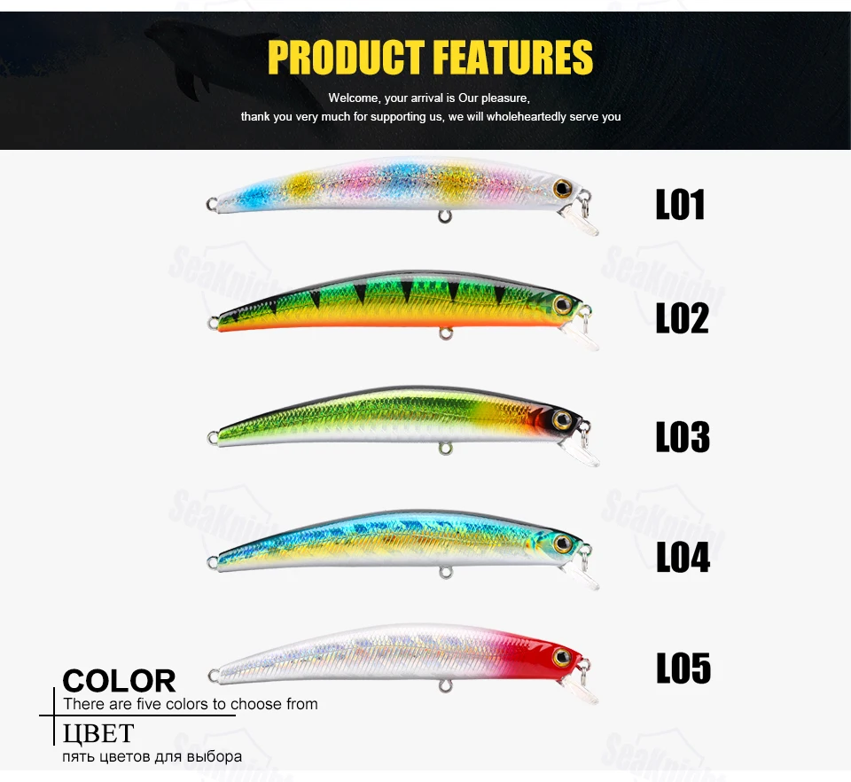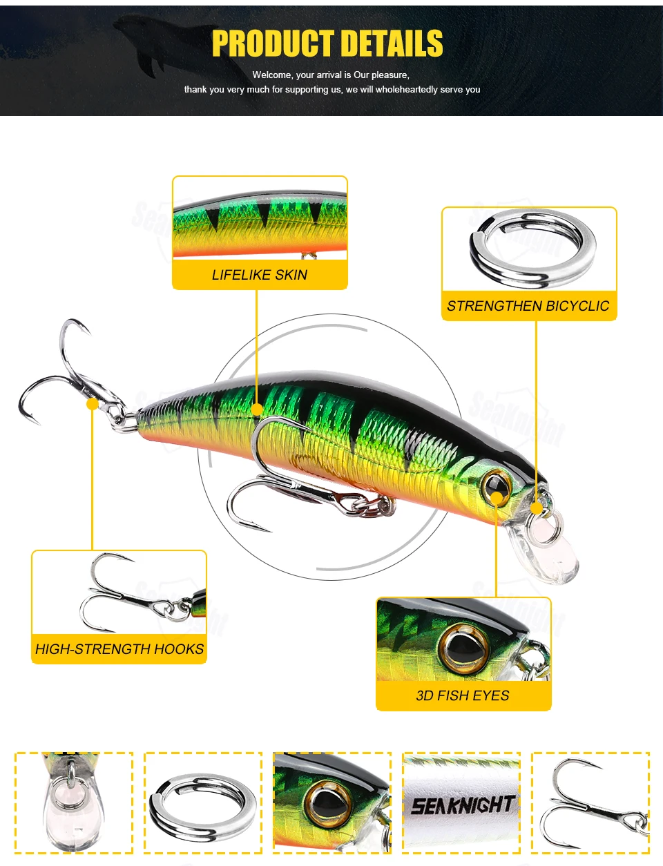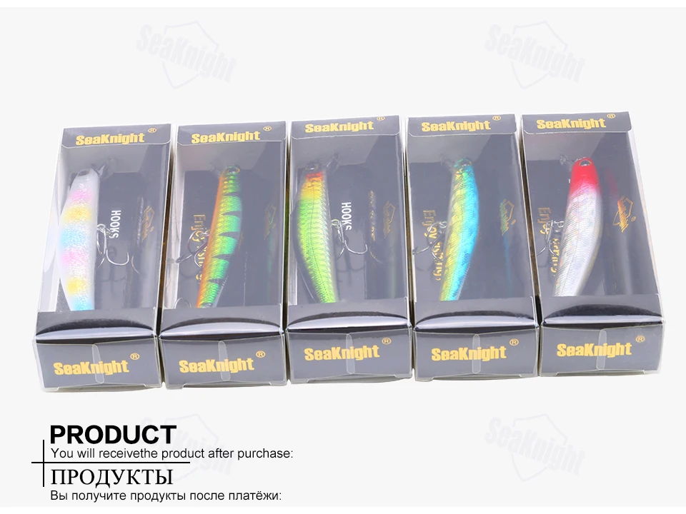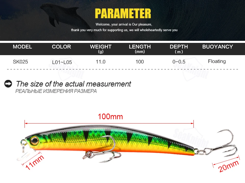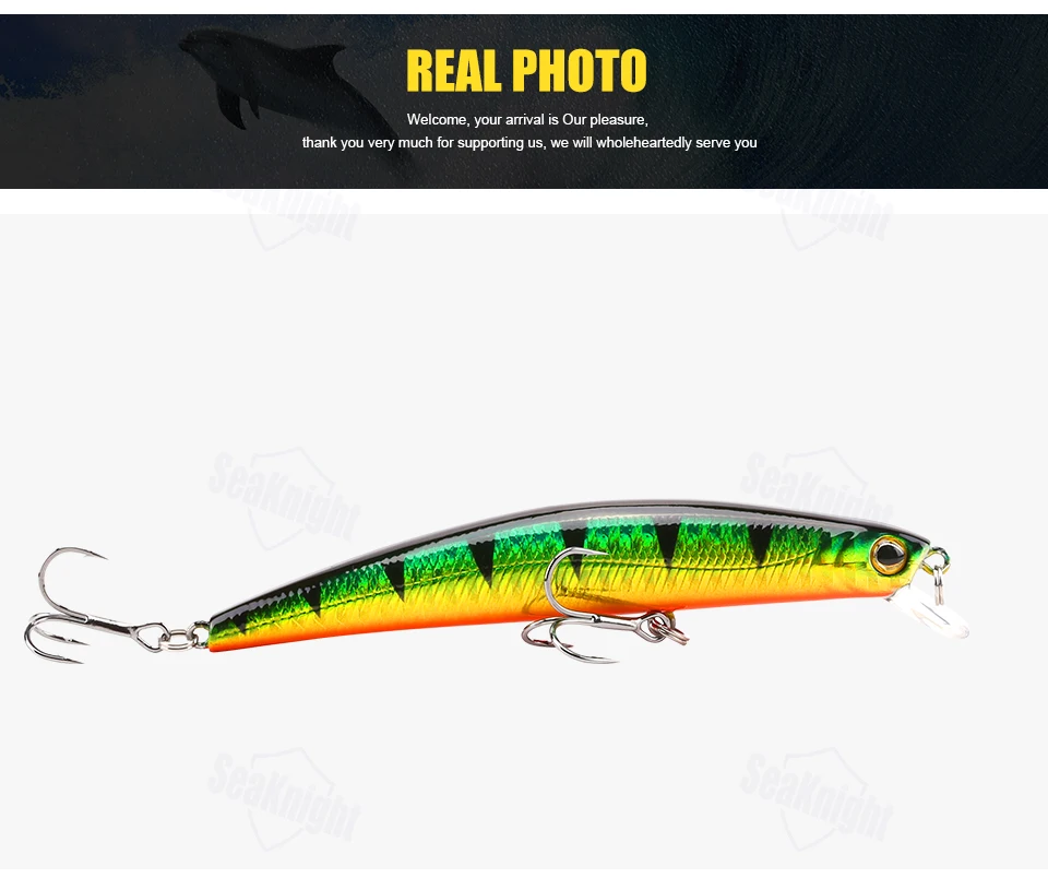 Marca: SeaKnightSeñuelo modelo: Minnow SK025Atraer tipo: duro señuelo de pescaSeñuelo Peso: 11g/0,39 ozAtraer Longitud: 100mm / 3.94inProfundidad: 0-0,5 M / 0-1,64 ftFlotabilidad: flotando atraer
