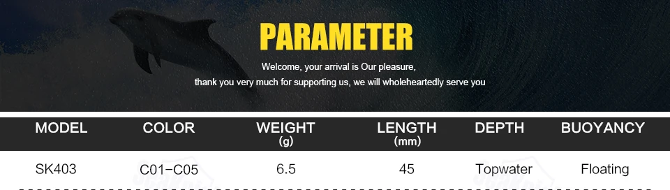 Tamaño del señuelo (SK403 6,5g): 6,5g / 45mm (0,23 oz / 1.77in)