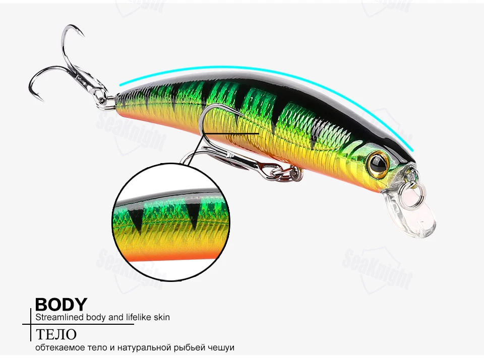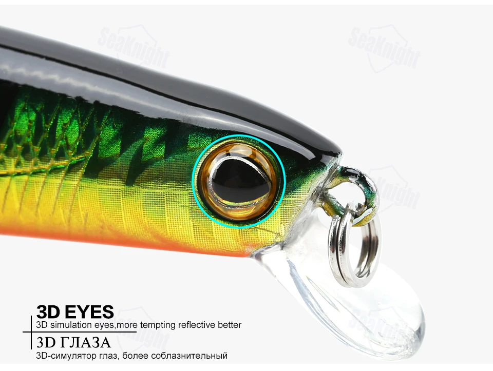 Características: 1. Ganchos: anticorrosión, potencia más fuerte, duradero, agua de mar de agua dulce universal. 2. Piel de pez de simulación (láser): el diseño de piel de pez de simulación la hace más atractiva para los peces grandes. 3. Bolas de Metal: Bolas de acero inoxidable en el interior, para mantener el equilibrio del señuelo de pesca, para la distancia más alta de lanzamiento. 4. Anillos bicíclicos más fuertes: fortalece el doble círculo y aumenta la resistencia a la tracción. 5. Ojos 3D de pez: ojos de simulación 3D, grandes y brillantes, más tentadores y reflectantes. 6. Embalaje del producto: Cada cebo se embala en una bonita caja de PVC al por menor. Detalles del producto Marca: SeaKnight Modelo de señuelo: Minnow SK025 Tipo de señuelo: señuelo de pesca duro Peso del señuelo: 11g/0,39 oz Longitud del señuelo: 100mm / 3.94in Profundidad de buceo: 0-0,5 M / 0-1,64 pies Flotabilidad: señuelo flotante Ganchos: Equipado con 2 ganchos anticorrosión de La piezas 5 colores: L01,L02,L03,L04,L05 Embalaje: Peso del artículo: 25g Peso del paquete: 45g Paquete que incluye: 1 ud. * señuelo de pesca (Puede elegir los colores: L01/L02/L03/L04/L05)