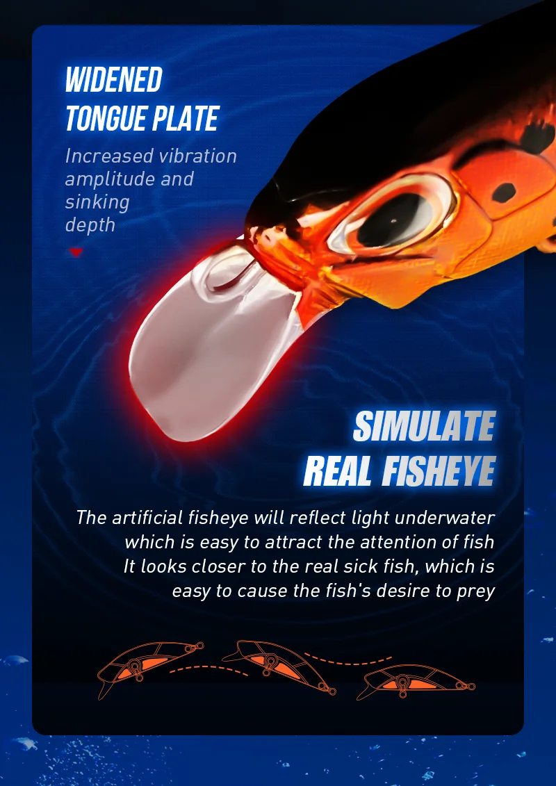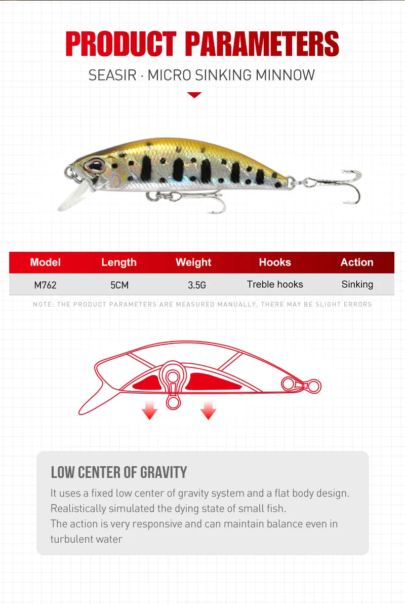 Utiliza un sistema de centro de gravedad bajo fijo y un diseño de cuerpo plano. Simula realisticamente el estado de muerte de los peces pequeños. La acción es muy receptiva y puede mantener el equilibrio incluso en aguas turbulentas.