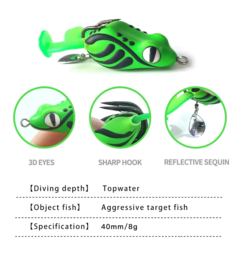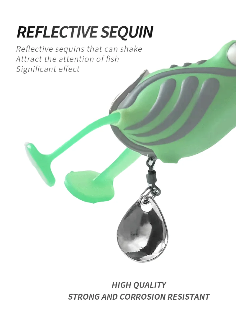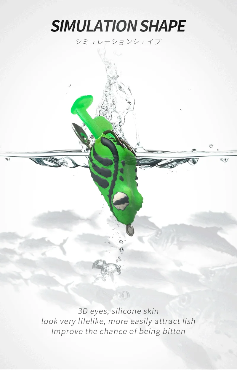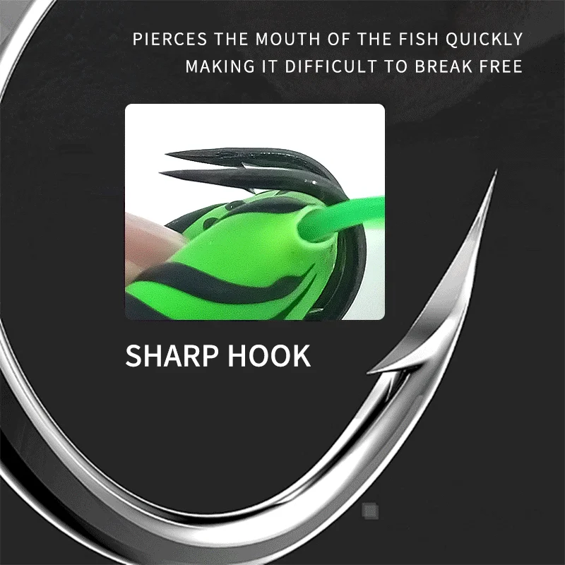 Durable soft silicone material.The frog body is very soft, elastic, and confusing, hollow silicone body ,Once the fish bite, it is difficult to loosen.