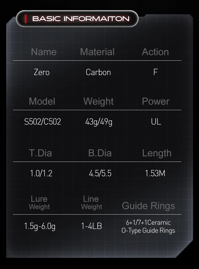 La varilla cero comienza con un increíble carbono.30T+carbono-carbono, caña hueca ligeramente, lo que no solo garantiza la resistencia, sensibilidad y precisión generales, sino que también proporciona una caña de pescar más liviana para mantener el flujo de energía.5 pies pesa sólo 43-49 g.Diseño ultraligero, no te sentirás cansado incluso después de un uso prolongado