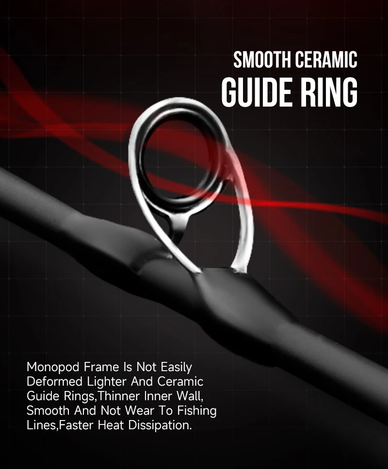 MonopiéEl marco no se deforma fácilmente. Más ligero yCerámicaAnillos guía, pared interior más delgada,Suave y sin desgaste para las líneas de pesca, disipación de calor más rápida, las guías de cerámica suaves y duraderas son un testimonio del compromiso de la caña con la longevidad y el rendimiento.