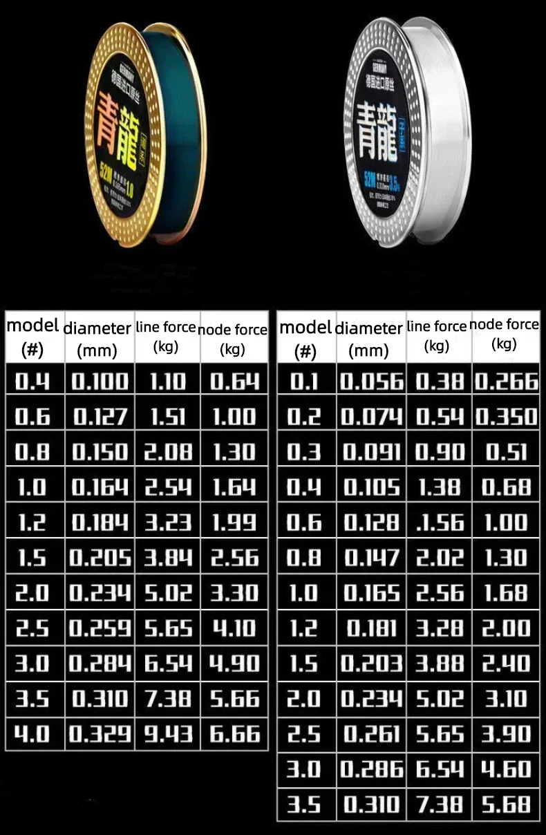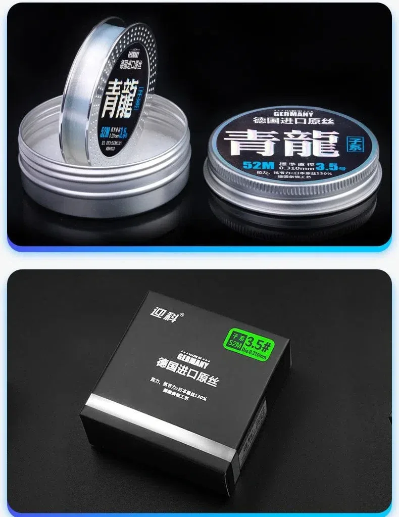 DescripciónNombre del producto: sedalMaterial: nailon Tipo: Mainline, tippet 52mPaquete: 2 piezasAviso: esta línea de pesca tiene solo 52 metros de largo.Características:1. Calidad de pesca profesional, fuerte y duradera.2. Ligero y resistente a la absorción de agua.