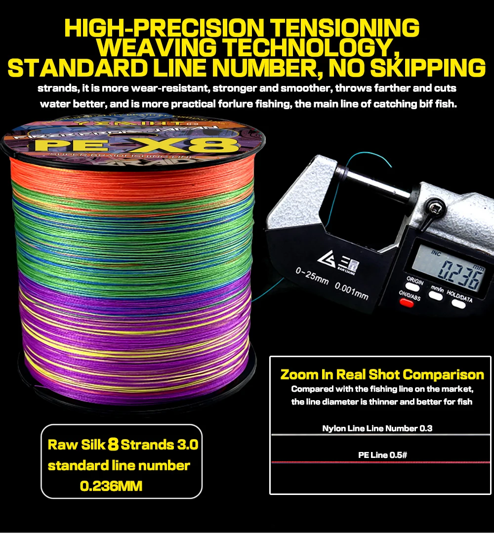 Línea de PE de 8 hebras, material de Japón, construcción trenzada única, hecha de fibras de PE de resistencia ultraalta.