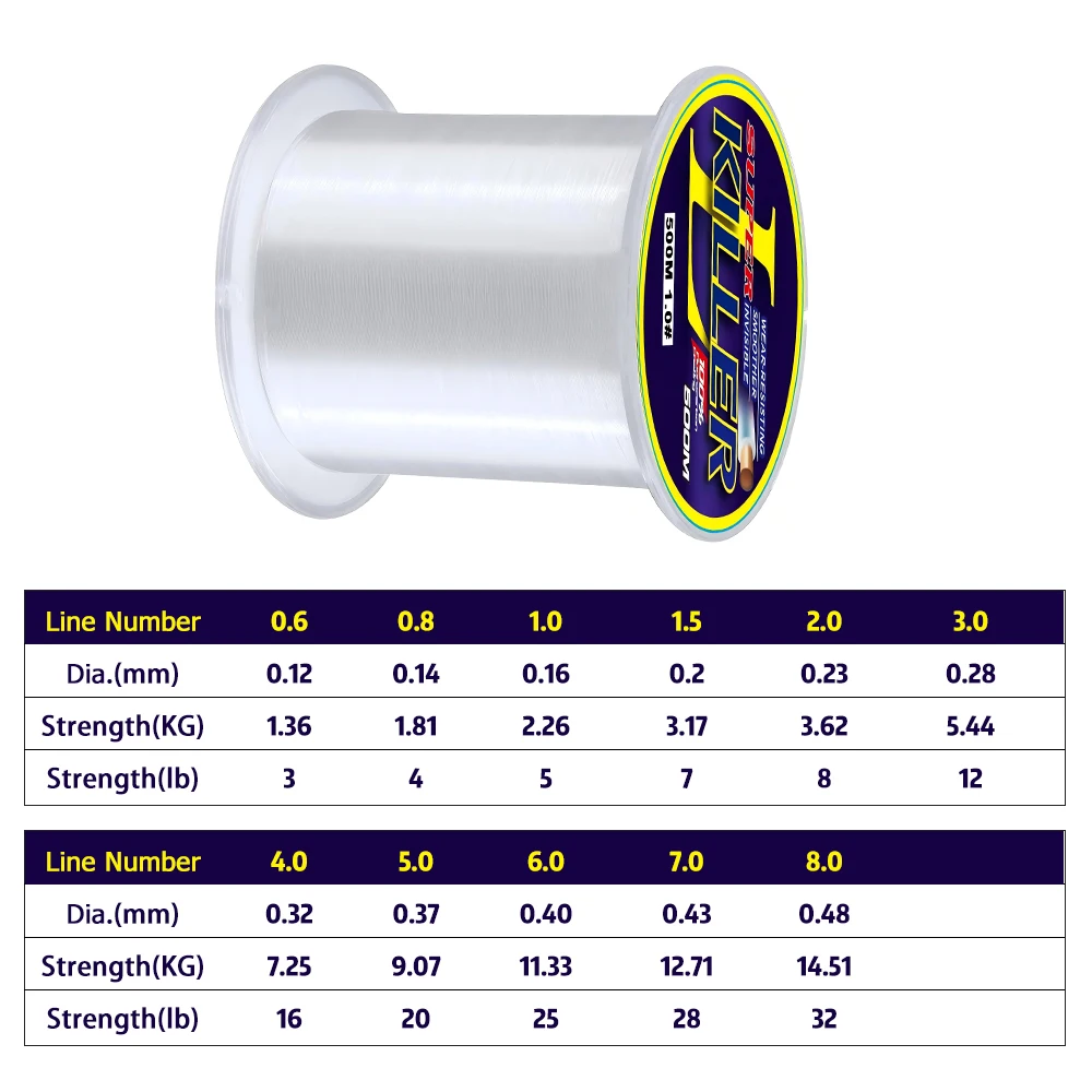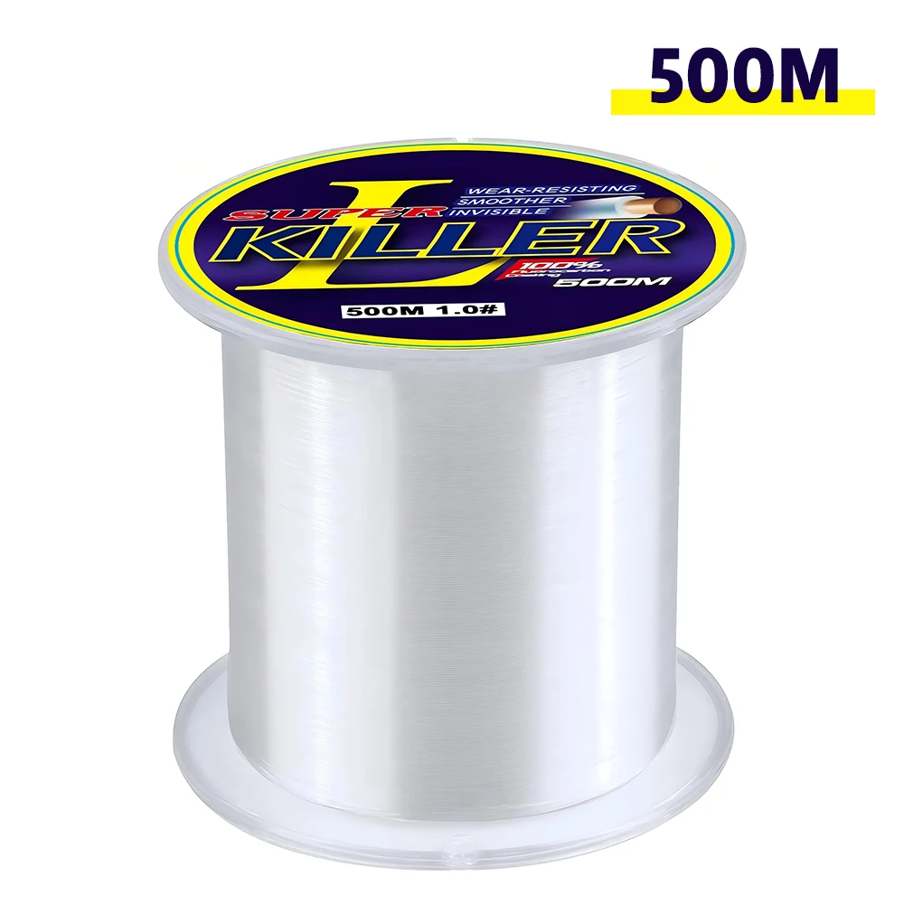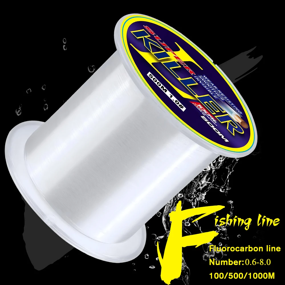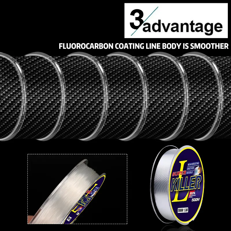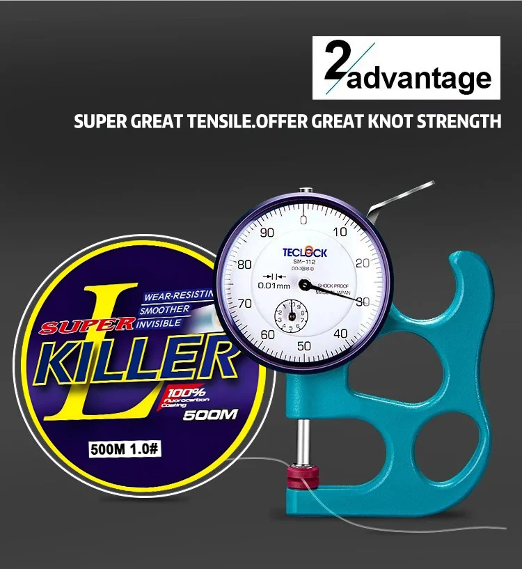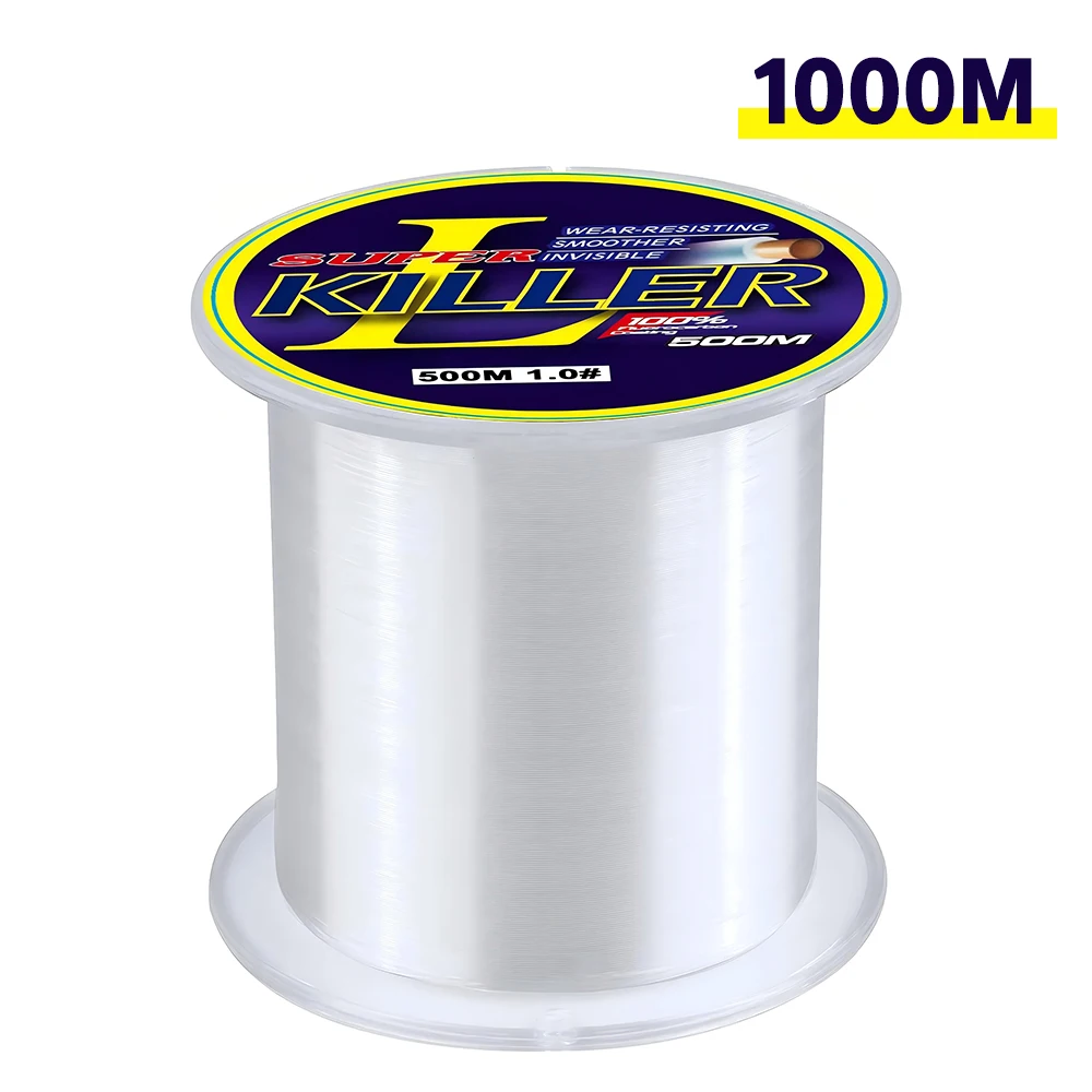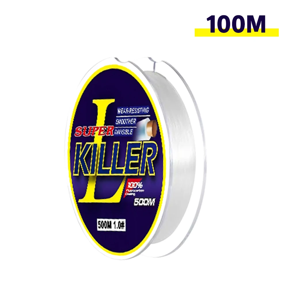 Línea híbrida: KILLER construido con un revestimiento exterior de fluorocarbono 100% con núcleo de copolímero, el revestimiento de fluorocarbono produce una excelente resistencia a los golpes, resistencia a la abrasión y resistencia al nudo para ofrecer lo último en resistencia al impacto, y el núcleo de copolímero añade flexibilidad, fuerza de nudo y memoria reducida