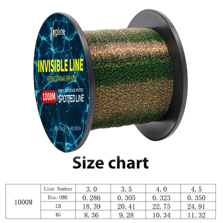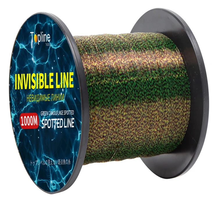 2. Línea de pescado manchado discolor: manchas de camuflaje biónico para una pesca más fácil. El color de la línea de pesca varía según el entorno, que es verde en fondo oscuro y marrón en fondo brillante.