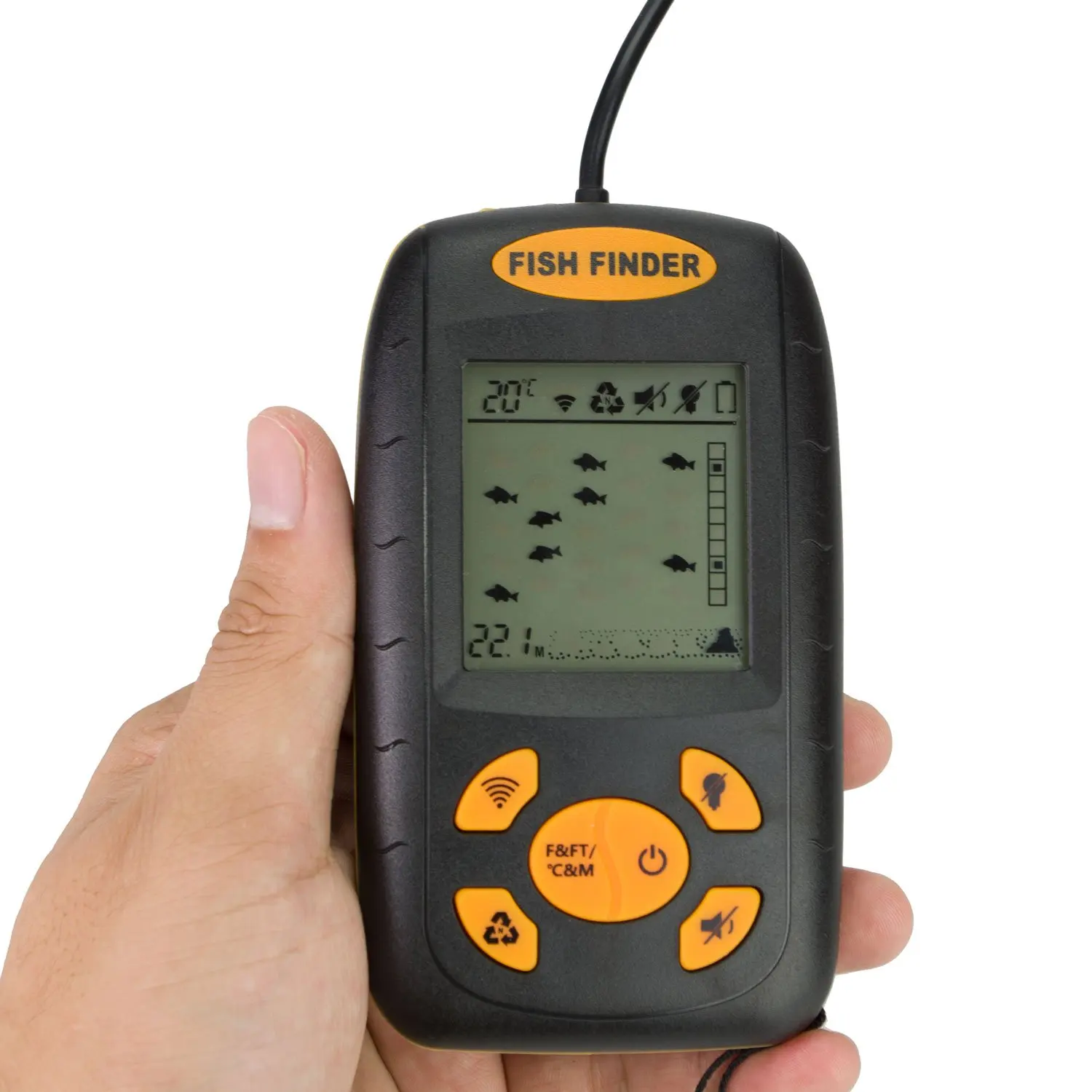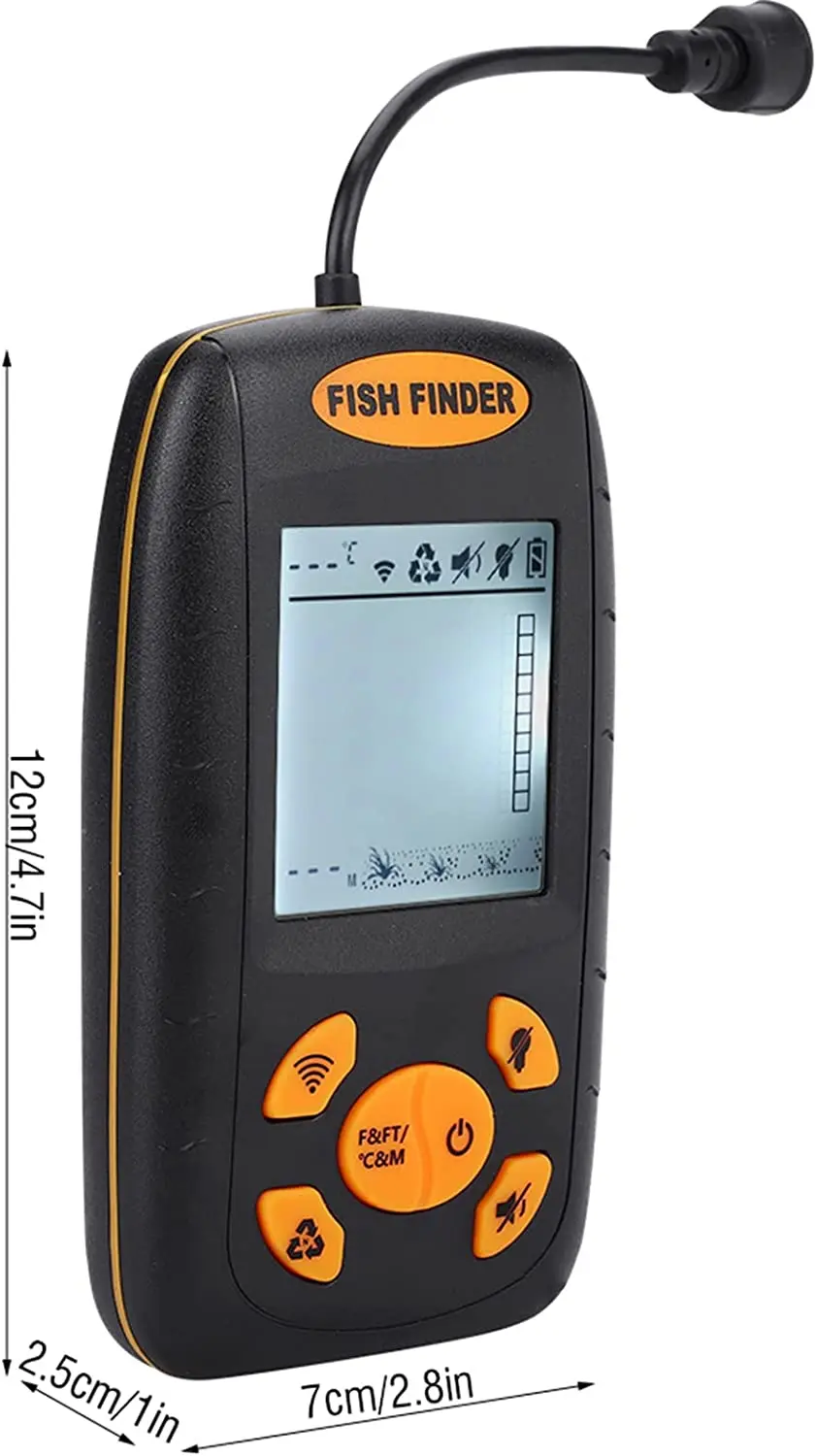 1. Pantalla LCD amplia y clara, la profundidad del agua se puede mostrar en pies o en metros. El Sensor de sonar de pesca tiene un cable de 25 pies y un flotador transductor extraíble.