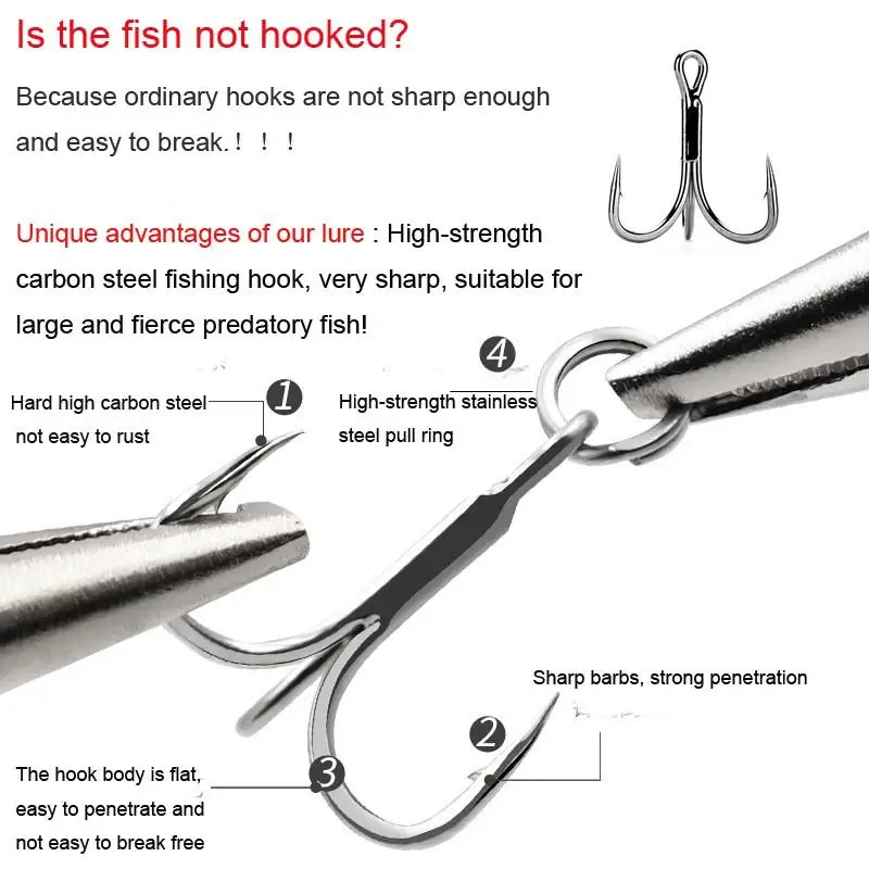 Con 2 anzuelos triples de púas, muy afilados y duraderos.Maravillosos accesorios de pesca para los amantes de la pesca.