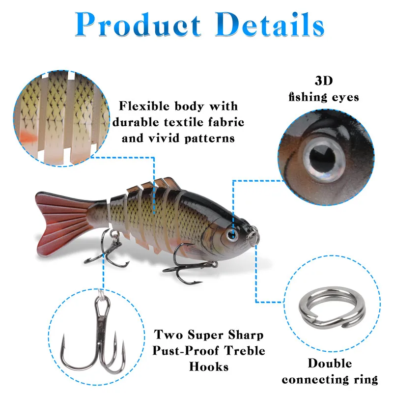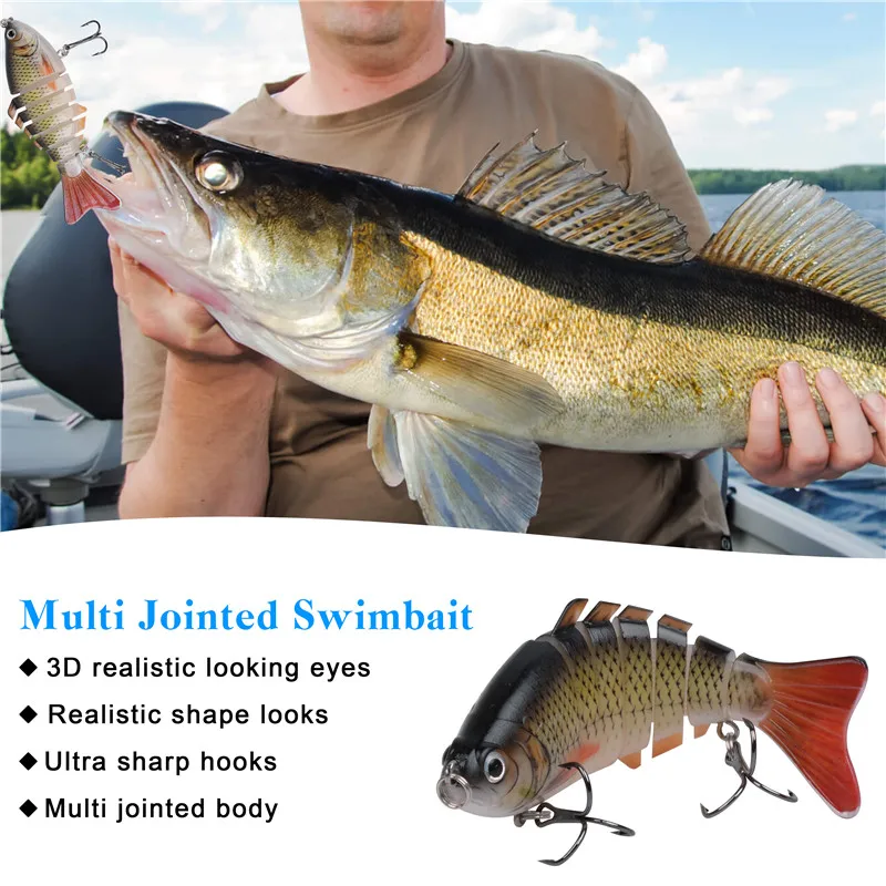 Material: ABS Material del gancho: acero al carbono Peso: 15g Cantidad: 5 uds. Paquete: bolsa de tela negra Colores: mezcla de colores (5 tipos de colores como la foto) Características: Diseño de múltiples secciones: color vivo y diseño Multi articulado y más duradero Ojos 3D: más atractivos y reales Gancho de acero rico en carbono: alta durabilidad y anticorrosión adecuado para agua dulce y agua salada Principal para Señuelos de Pesca Walleye de lubinas, fácil de atrapar Nota: puede haber algunos errores de medición, no se preocupe. Gracias