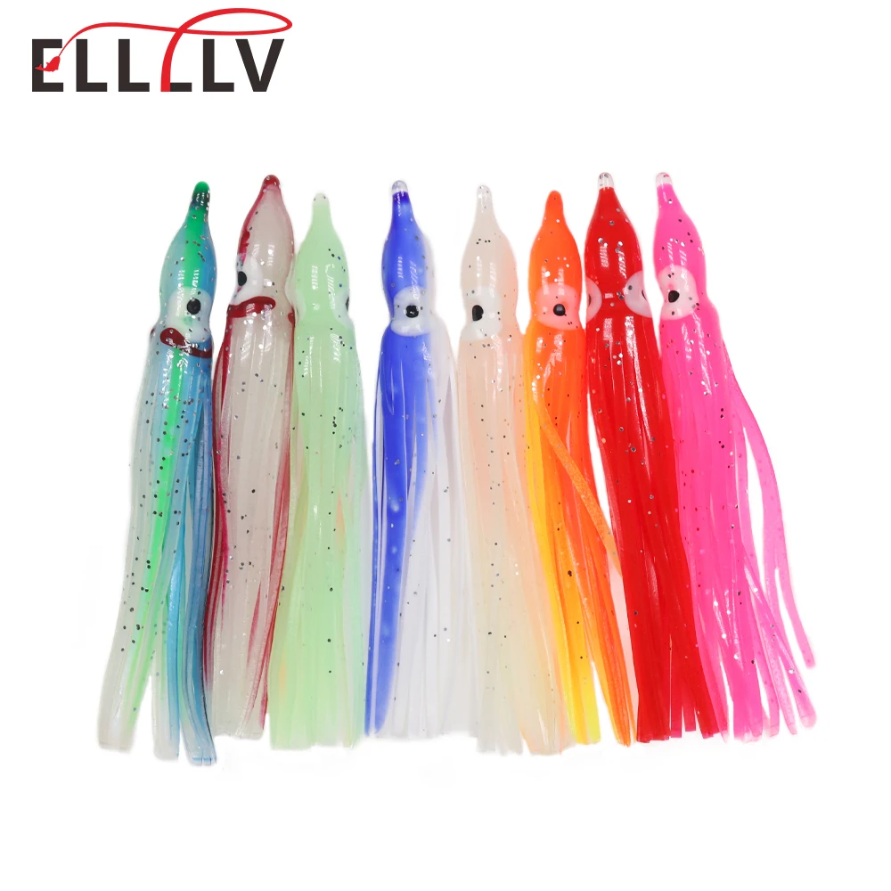 2 bolsas 10 piezas 9cm faldas de calamar suave plástico luminoso cebo de pulpo pesca de agua salada señuelo Artificial mezcla de colores Lumo rojo azul naranja rosa