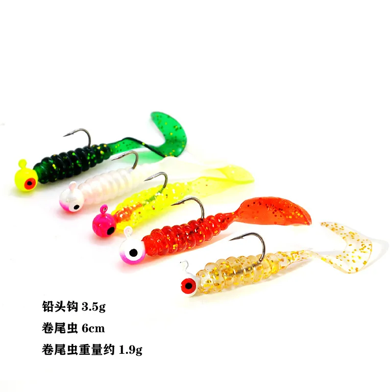 Señuelo blando de pesca, cebo de 3,5g, cabeza de anzuelo, pez, 6cm, cola de hoz, gusano, señuelos artificiales, lote de 5 piezas en oferta