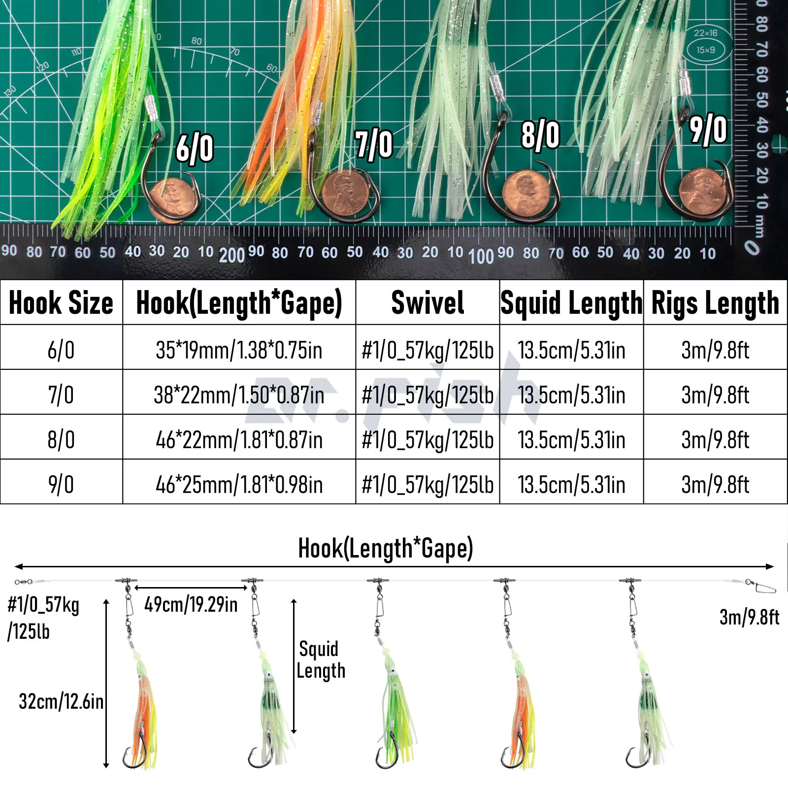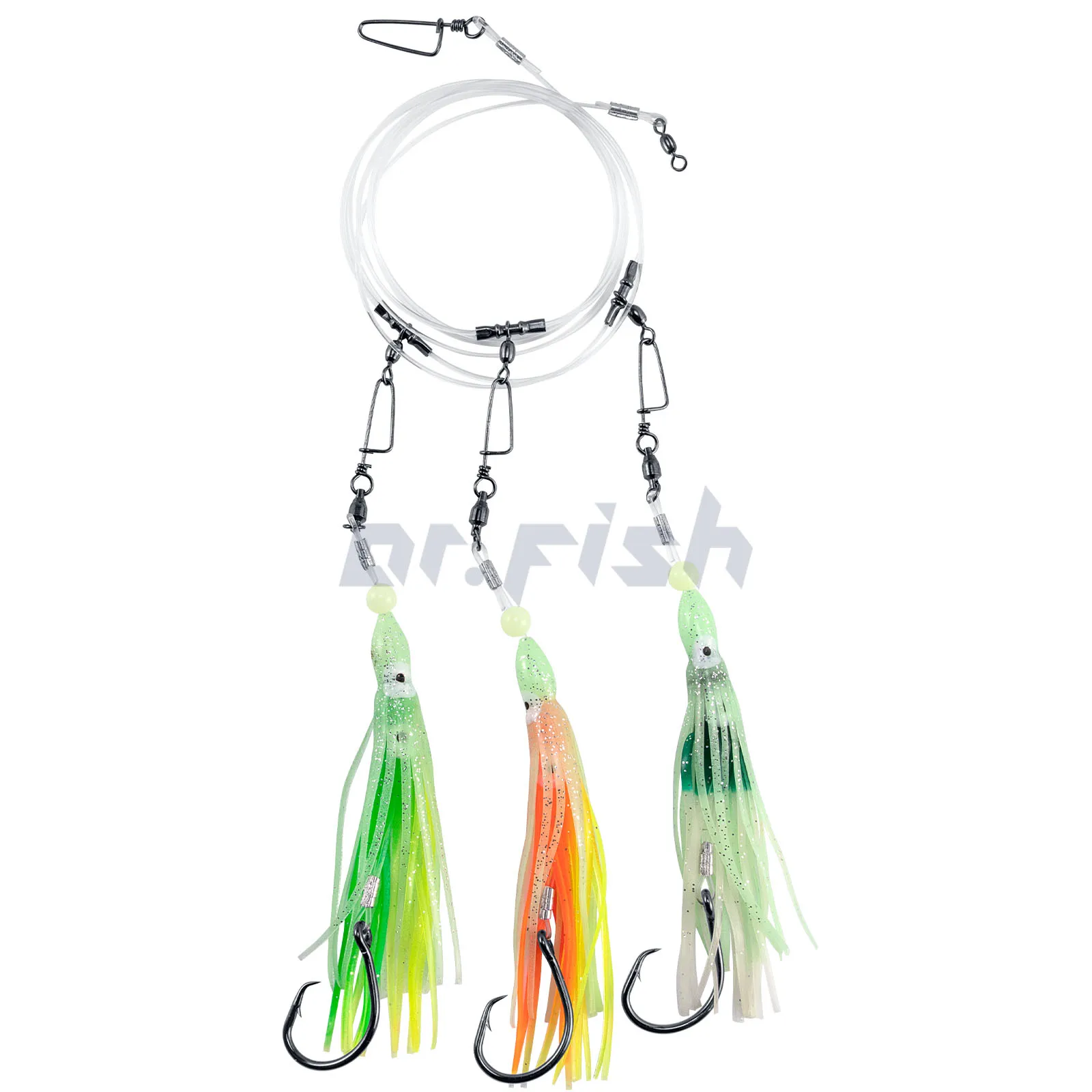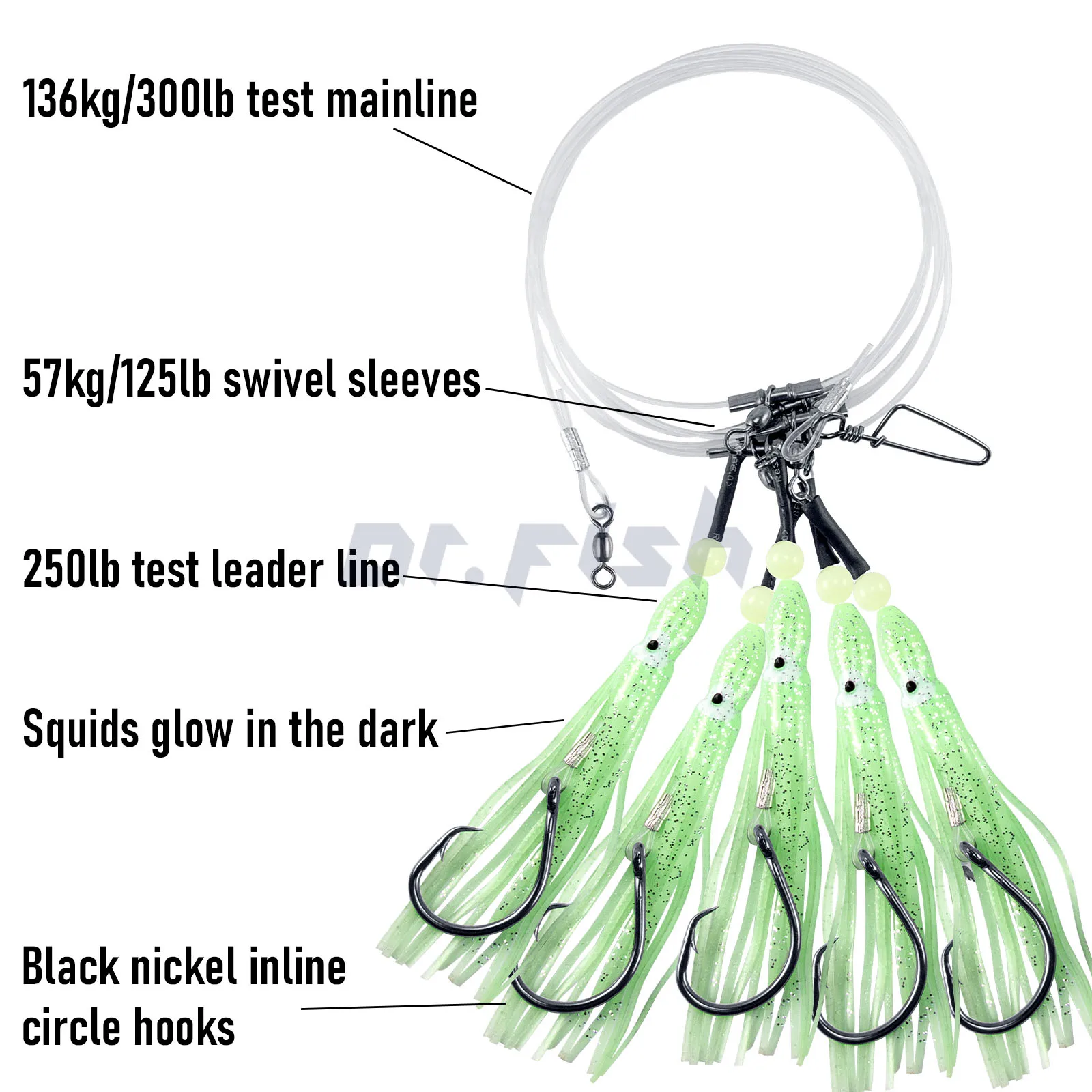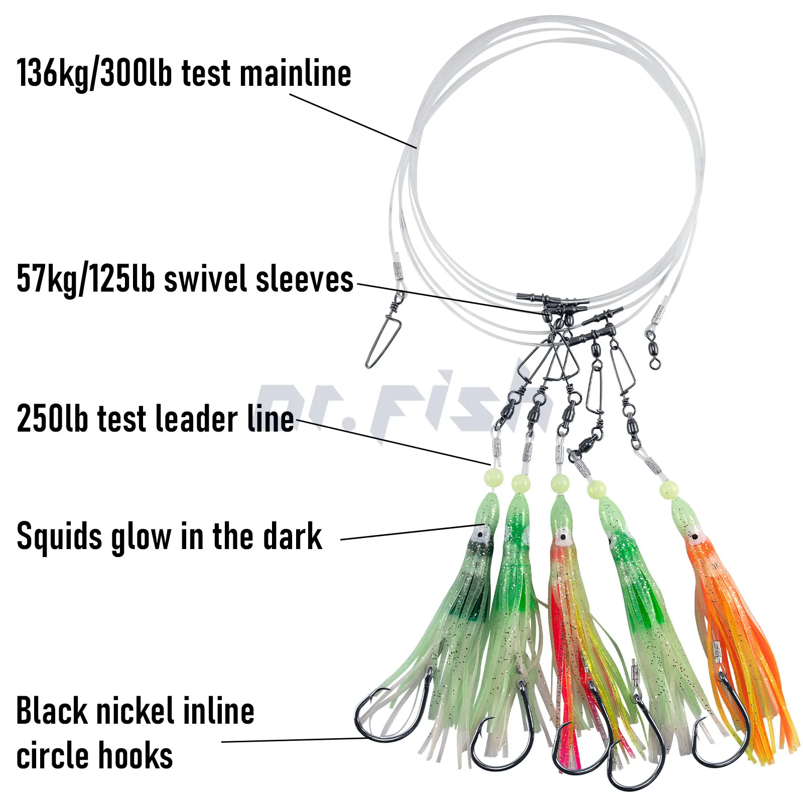 1. El aparejo de calamar de caída profunda es una configuración de curricán versátil que incluye 300LB mono y 5 calamares con 6/0 anzuelos, proporcionando la máxima resistencia y durabilidad para sus necesidades de pesca.