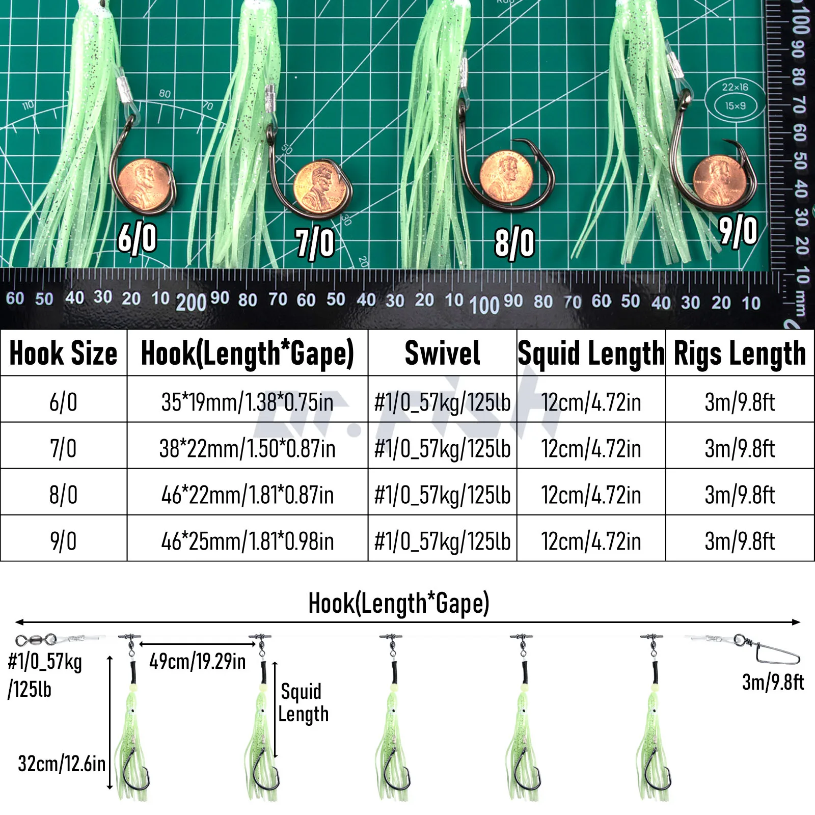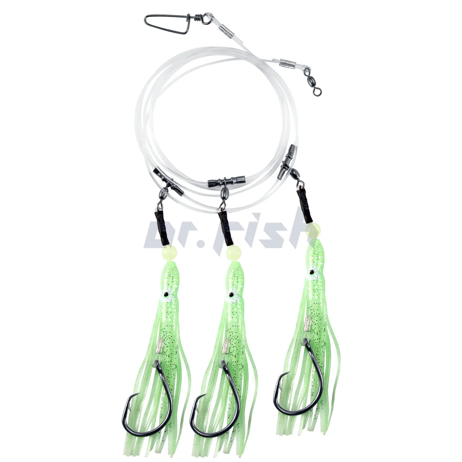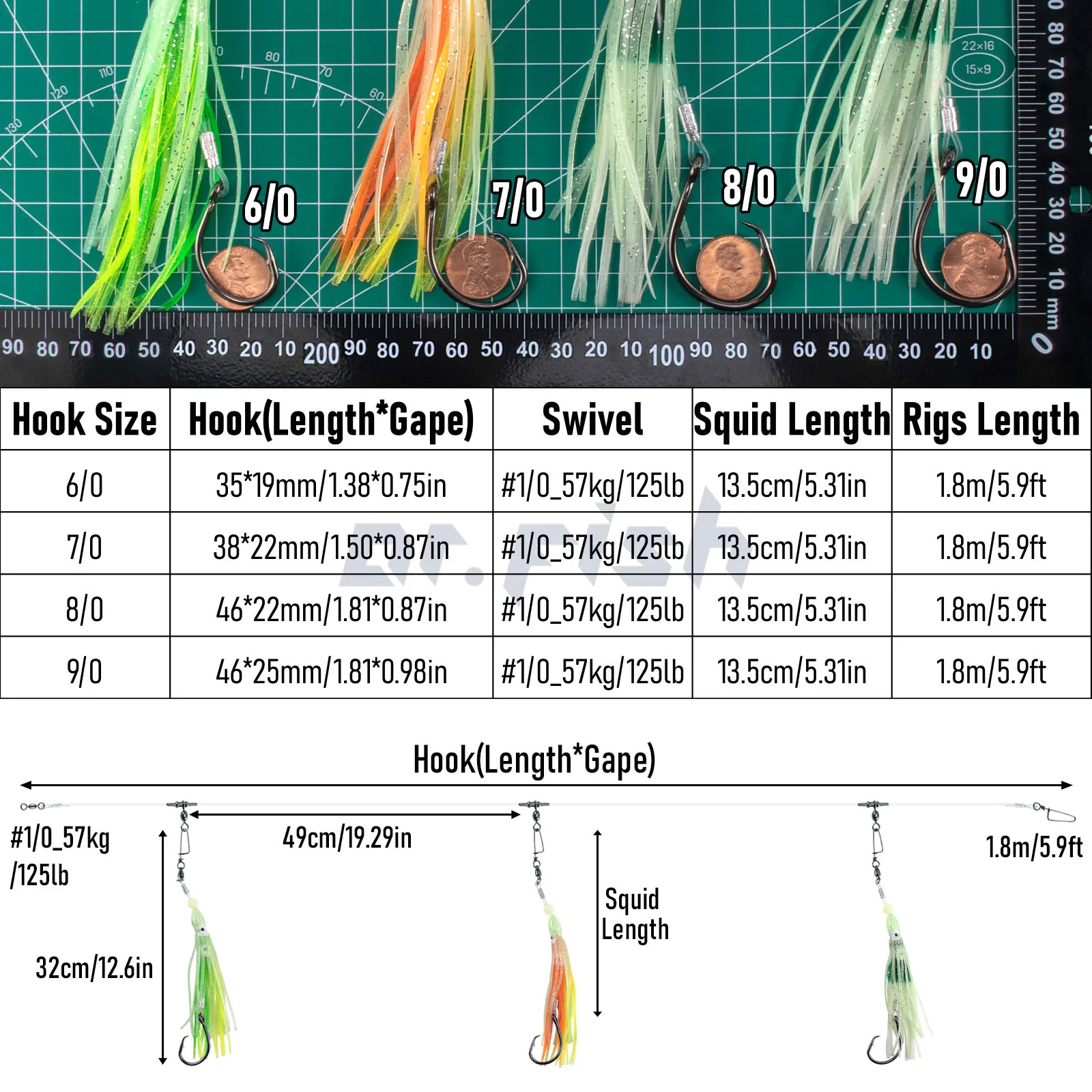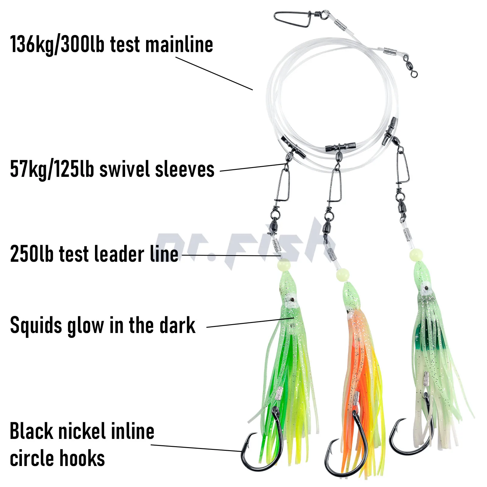 1. El aparejo de calamar de caída profunda es una configuración de curricán versátil que incluye 300LB mono y 5 calamares con 6/0 anzuelos, proporcionando la máxima resistencia y durabilidad para sus necesidades de pesca.
