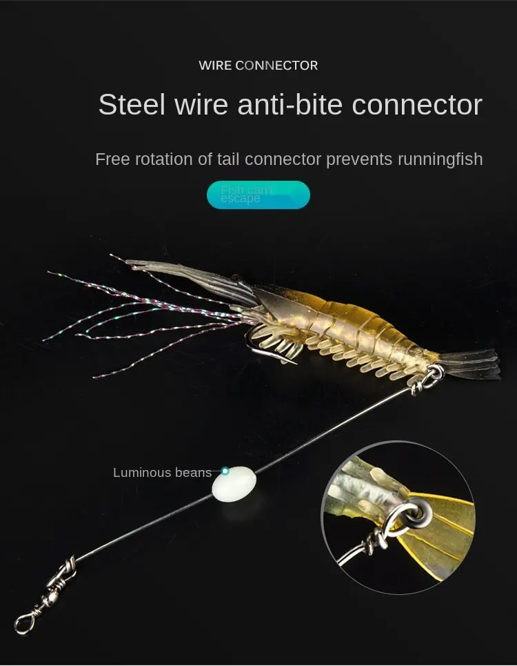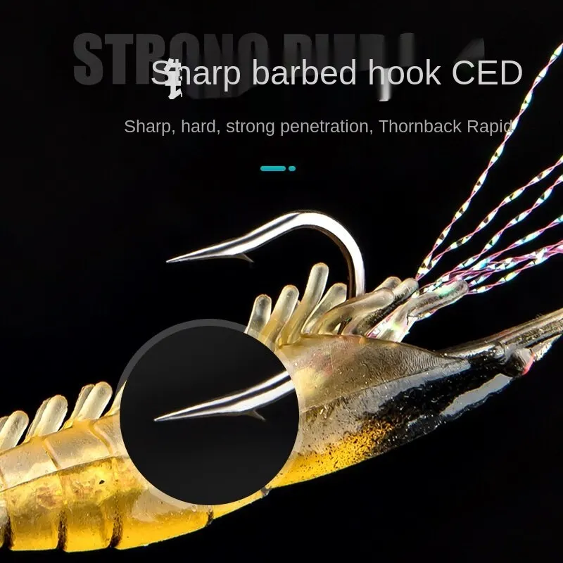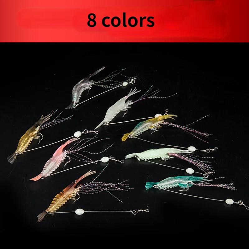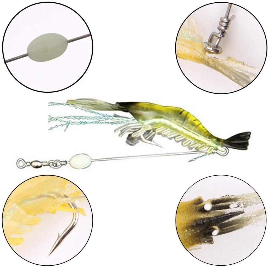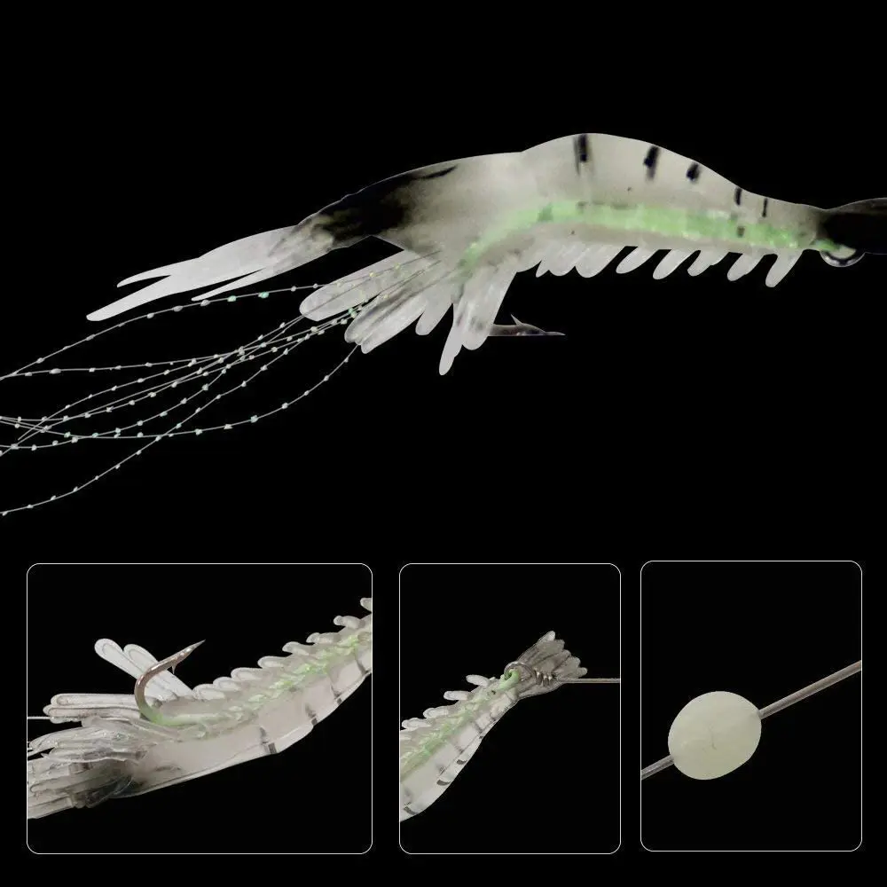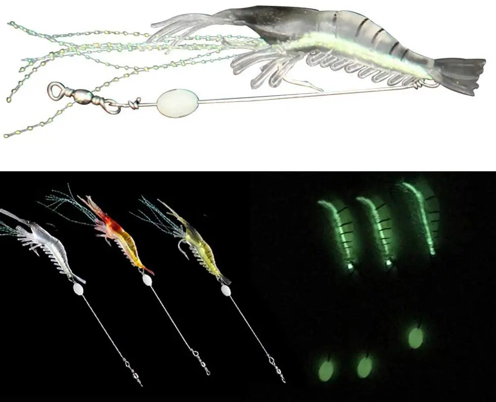 (1) El juego de señuelos de camarón suave tiene material fluorescente colocado en el anzuelo interior, bueno para la pesca nocturna.Las cuentas luminosas realzan el efecto de pesca nocturna.