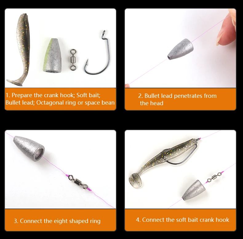 1.Prepare el anzuelo de manivela; Cebo blando; Plomo de bala; Anillo octogonal o frijol espacial