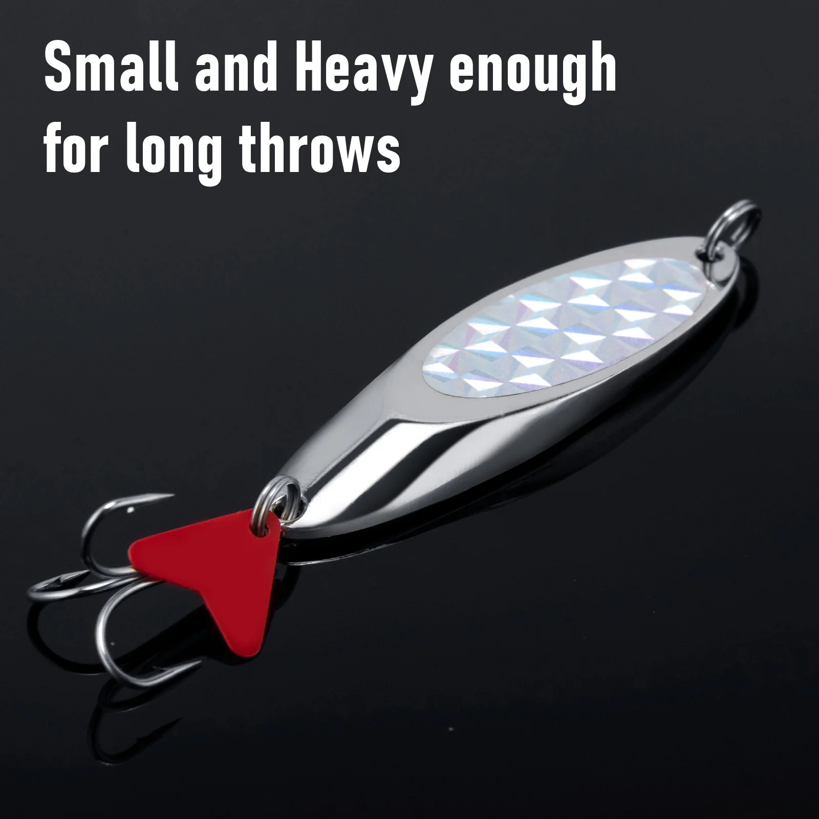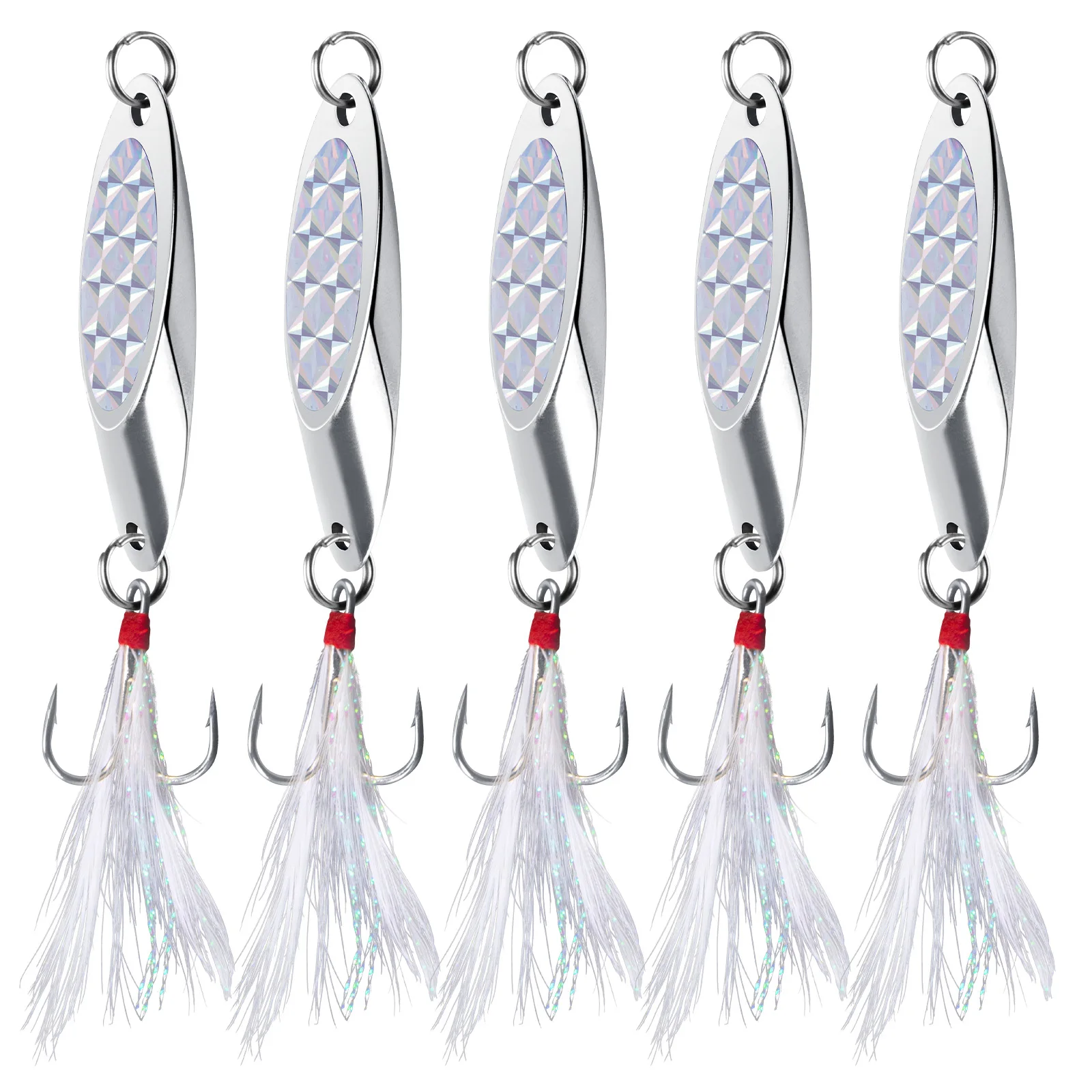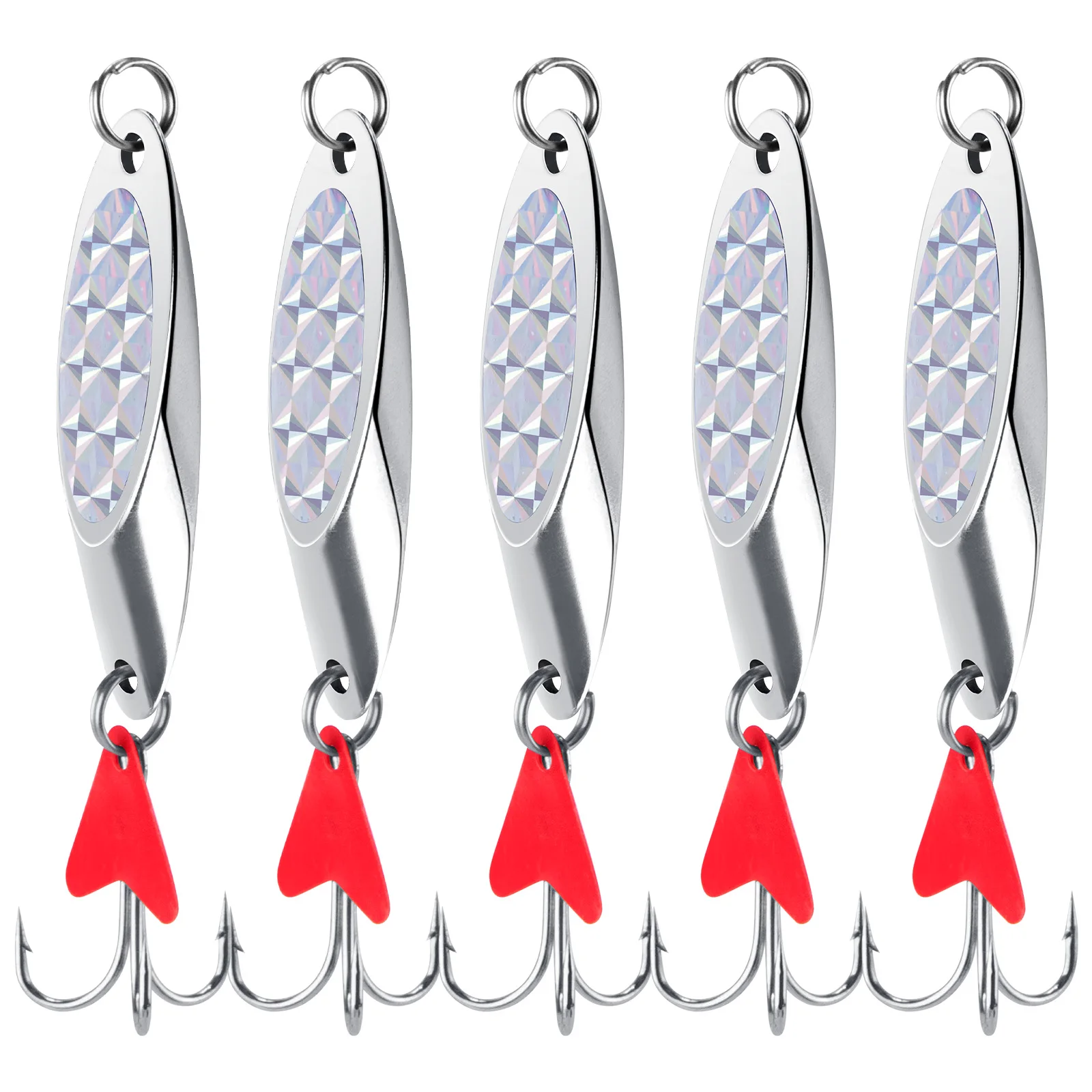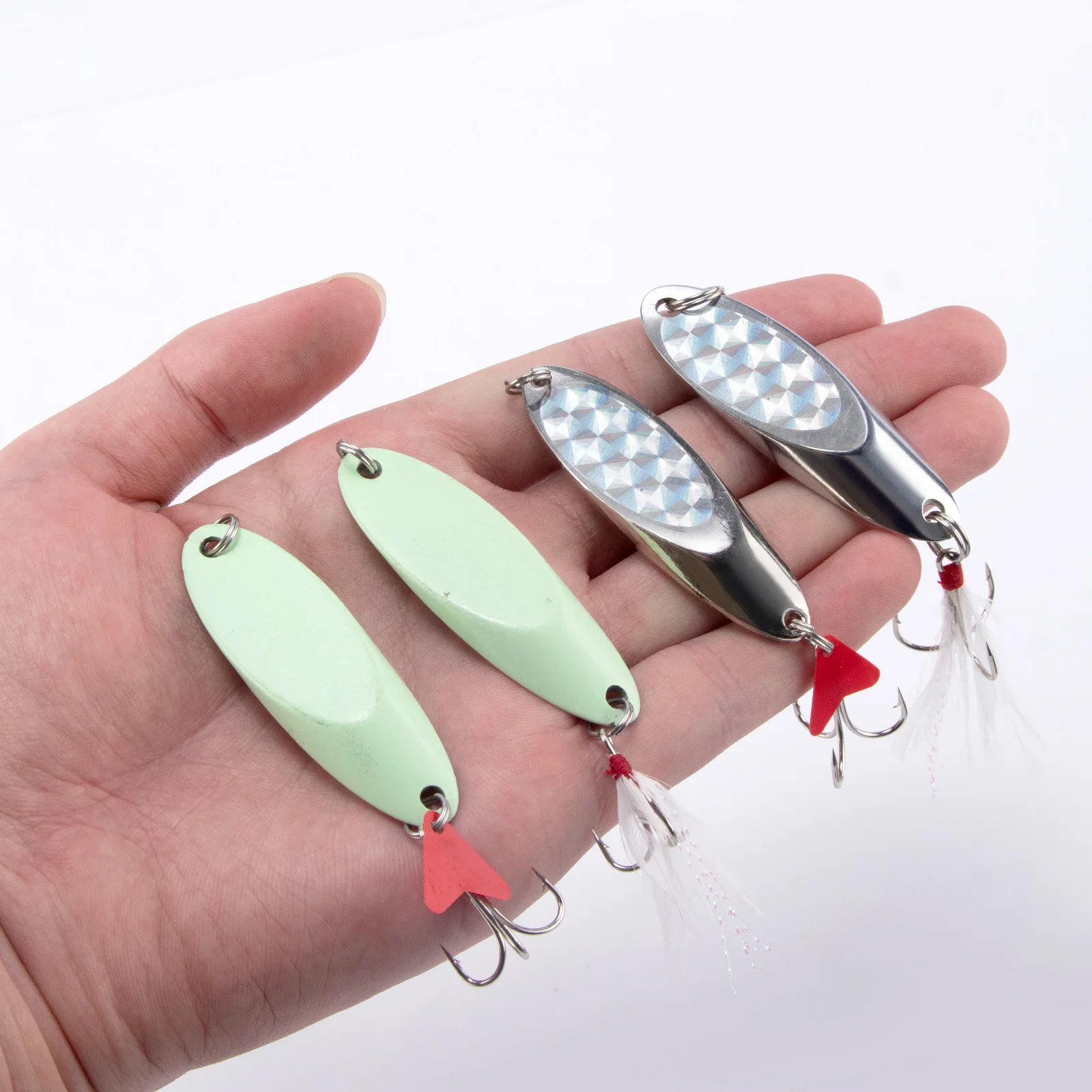 Las cuñas plateadas compactas con lámina flash 3D realmente brillan y llaman la atención de cualquier pez que pasa.También puede elegir una con hojas de sonajero de plástico para atraer peces con sonido.Un estilo que brilla en la oscuridad también está disponible para la pesca nocturna.