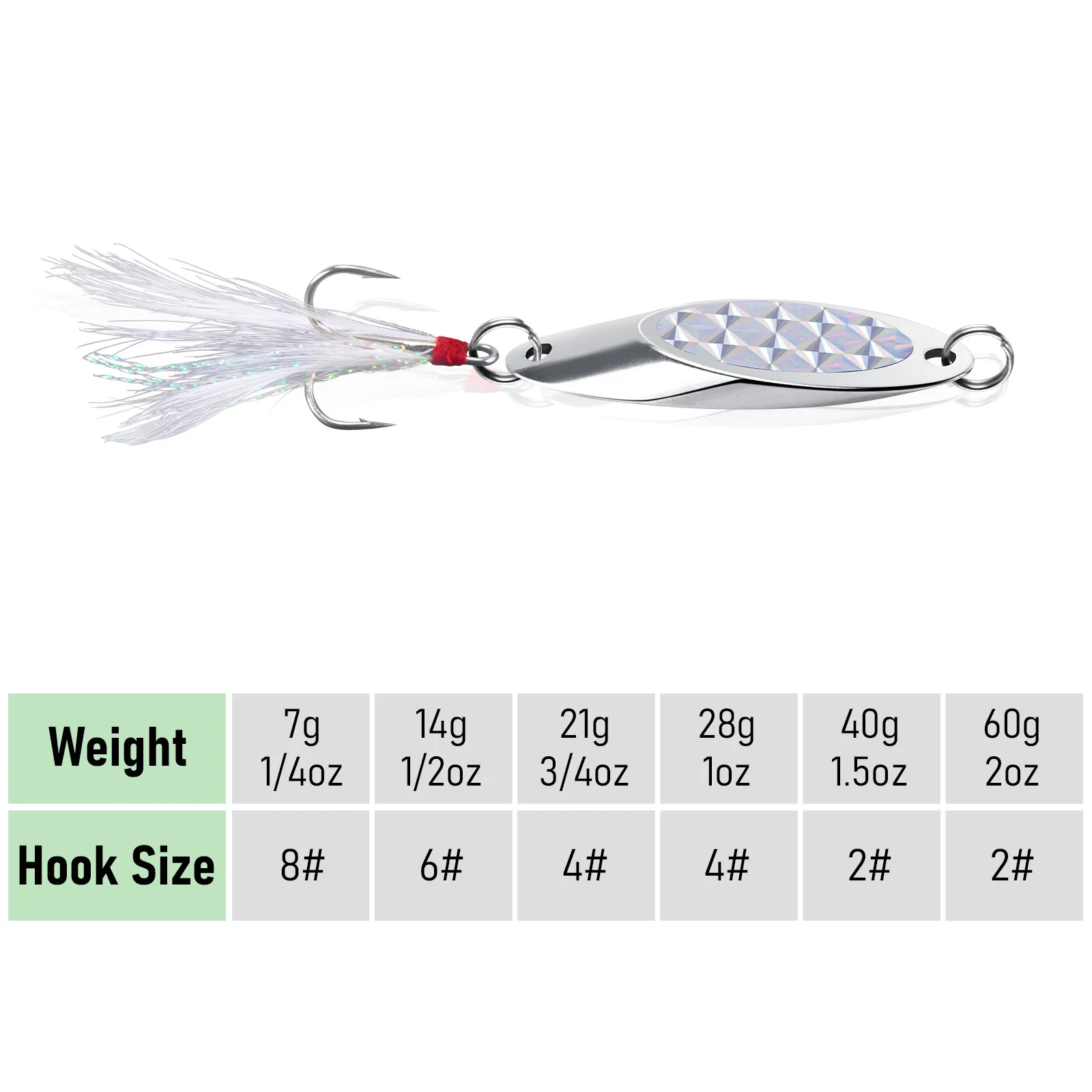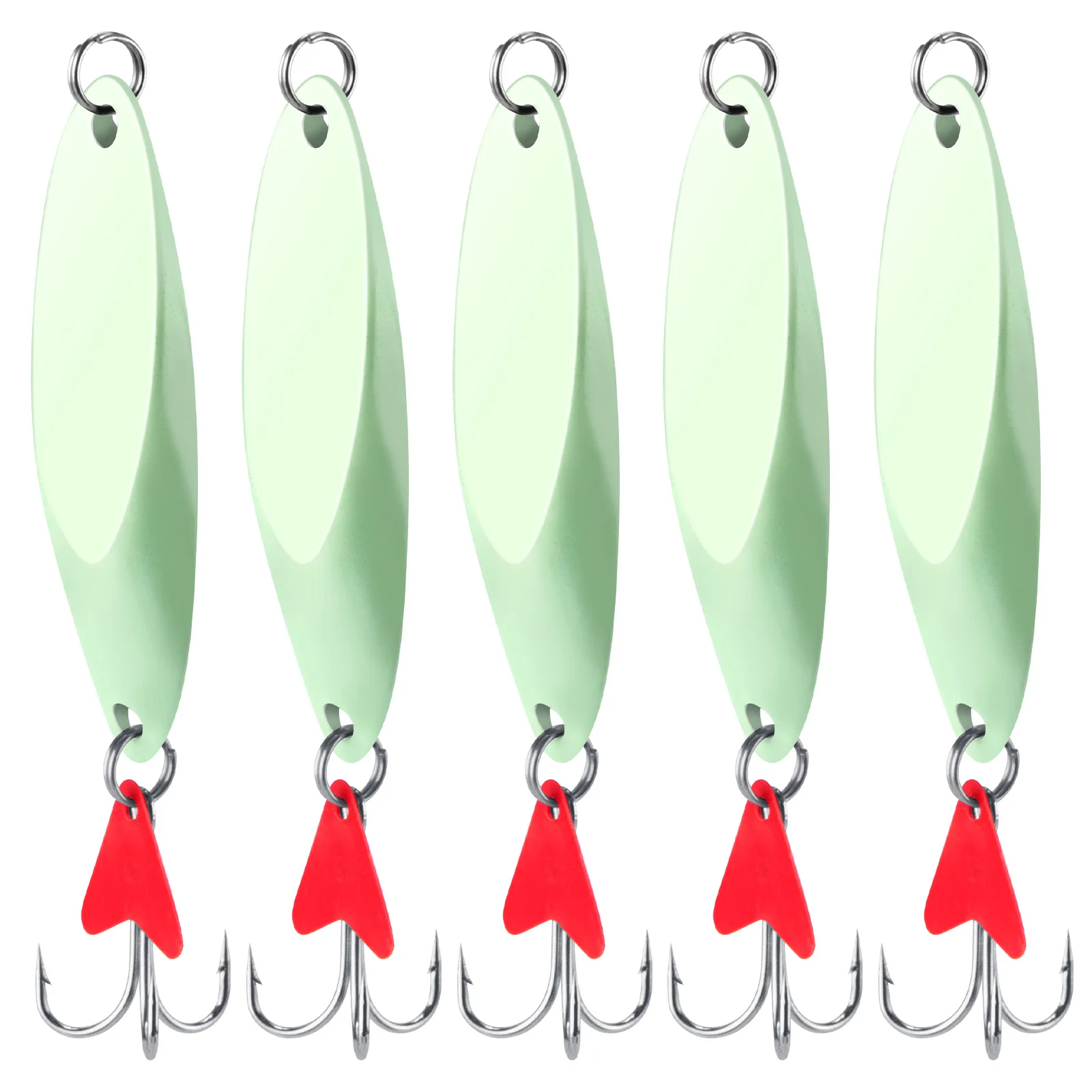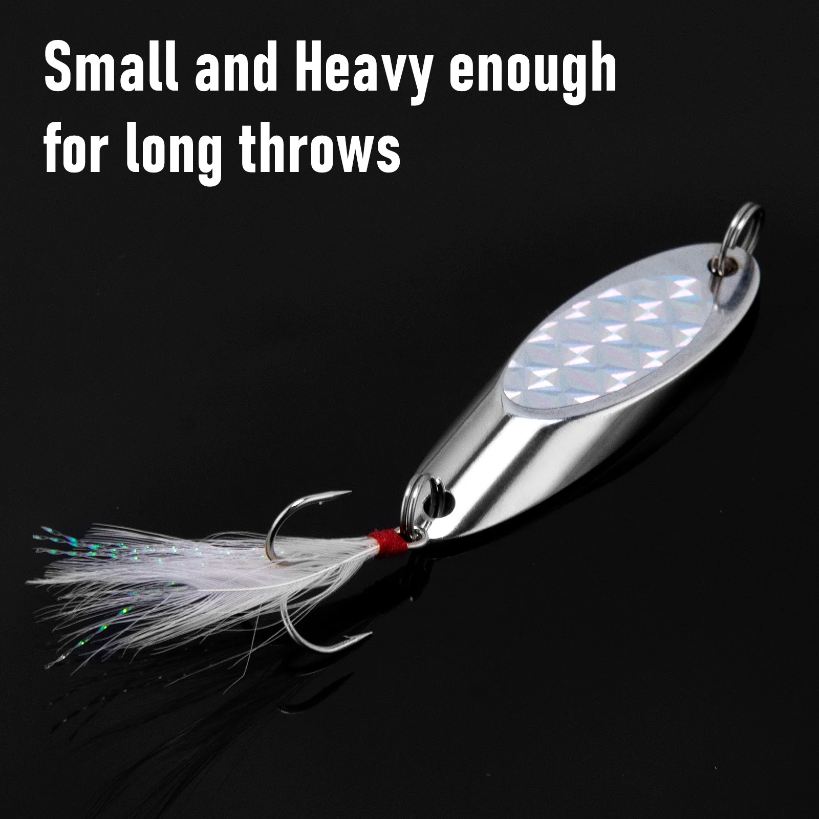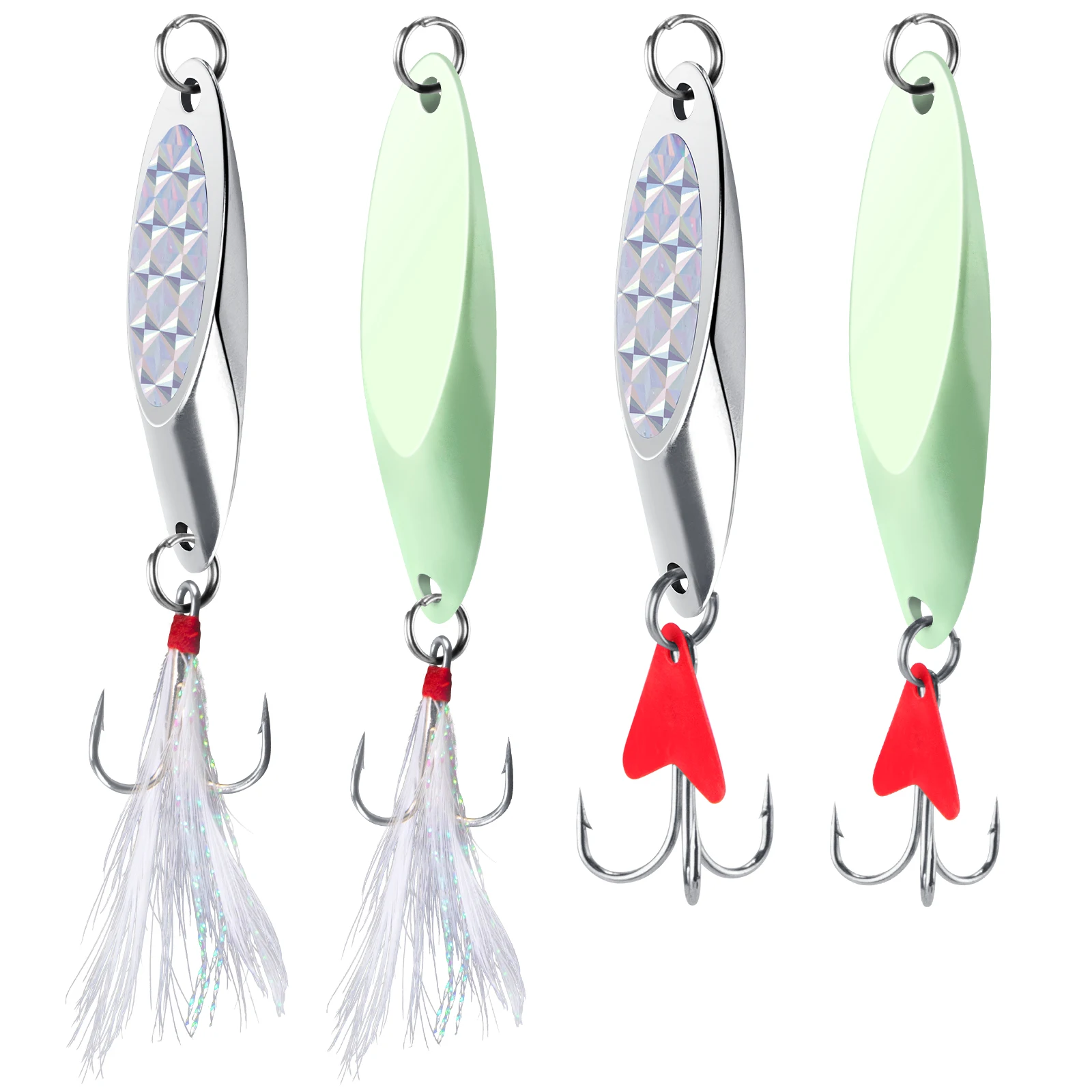Las cuñas plateadas compactas con lámina flash 3D realmente brillan y llaman la atención de cualquier pez que pasa.También puede elegir una con hojas de sonajero de plástico para atraer peces con sonido.Un estilo que brilla en la oscuridad también está disponible para la pesca nocturna.