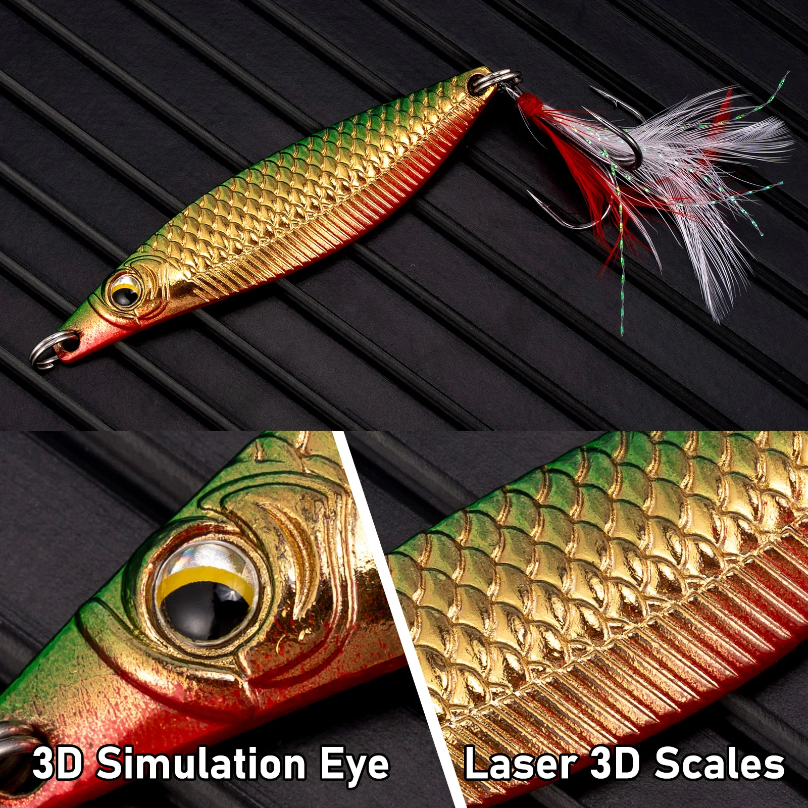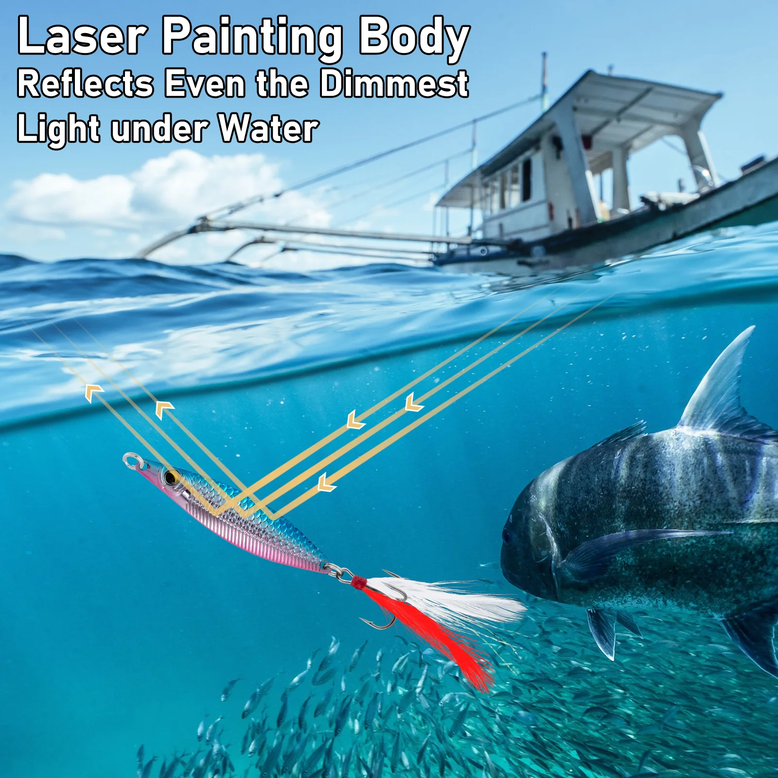 Atracción intermitente: el recubrimiento láser de escamas de peces de diseño especial es capaz de reflejar la luz solar/luz de la luna/otra luz en una luz brillante de colores completamente atractiva, que maximizan el uso de la luz y atraen a los peces desde una distancia más lejana.