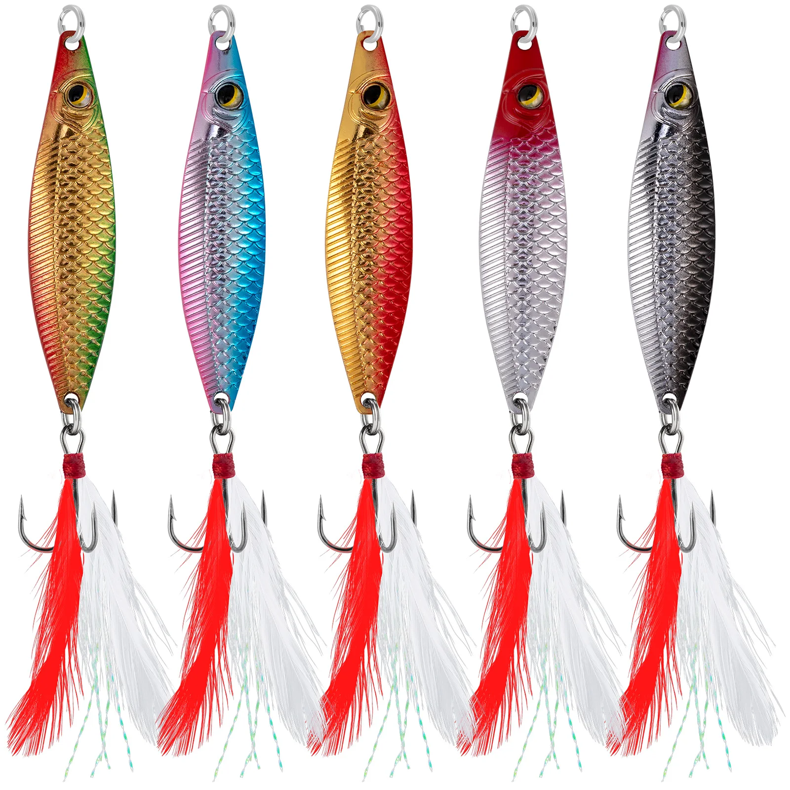 Ganchos de plumas ultra afilados: Ganchos triples de alta calidad, que son duros, afilados y antidesgaste, el anzuelo puede perforar el cuerpo del pez instantáneamente y la lengüeta engancha el pez desde la dirección opuesta para evitar que se escape de manera efectiva.