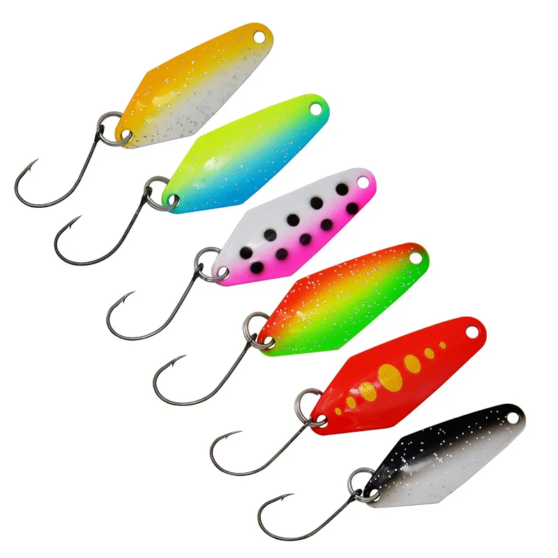 Señuelo de cuchara de pesca 2,3g 3g señuelos artificiales cucharas coloridas Salmo trucha anzuelo único 6 colores lote 6 piezas venta