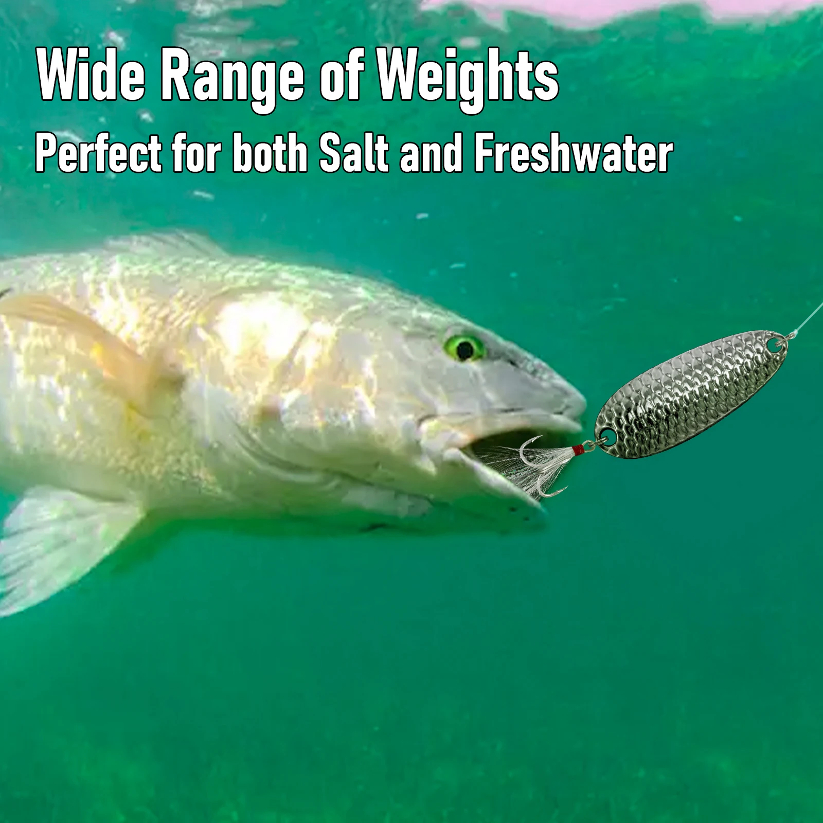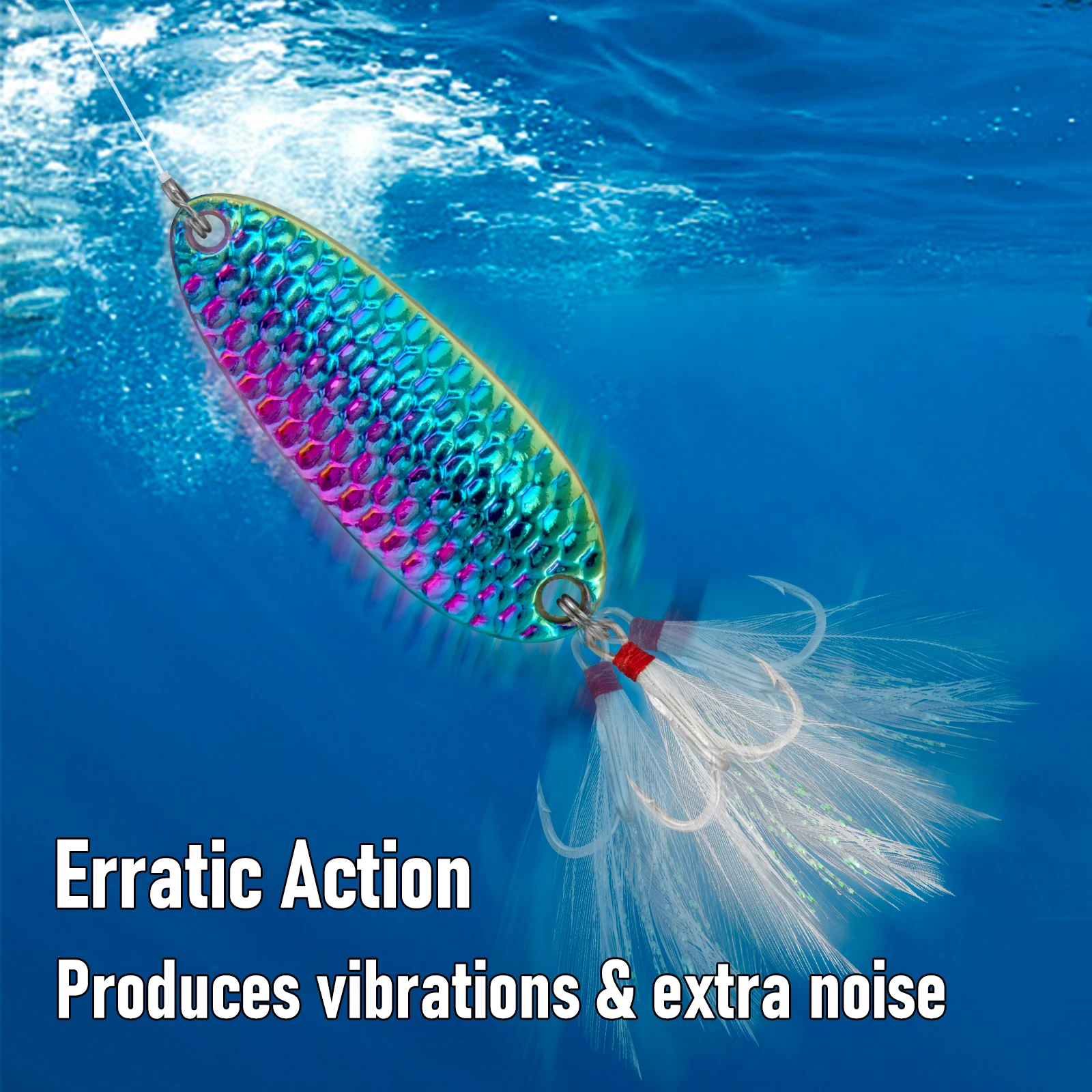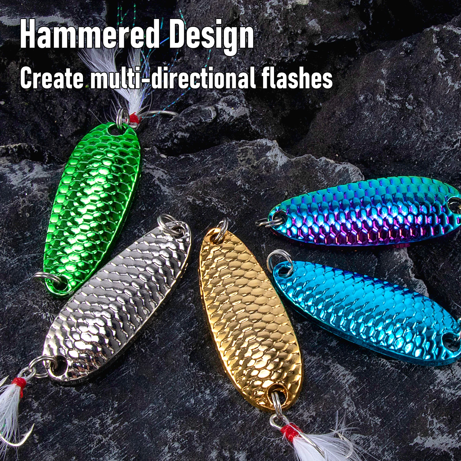 El diseño martillado ofrece destellos brillantes pronunciados en el agua, lo que maximiza el reflejo de la luz y atrae a los peces desde una distancia mayor.