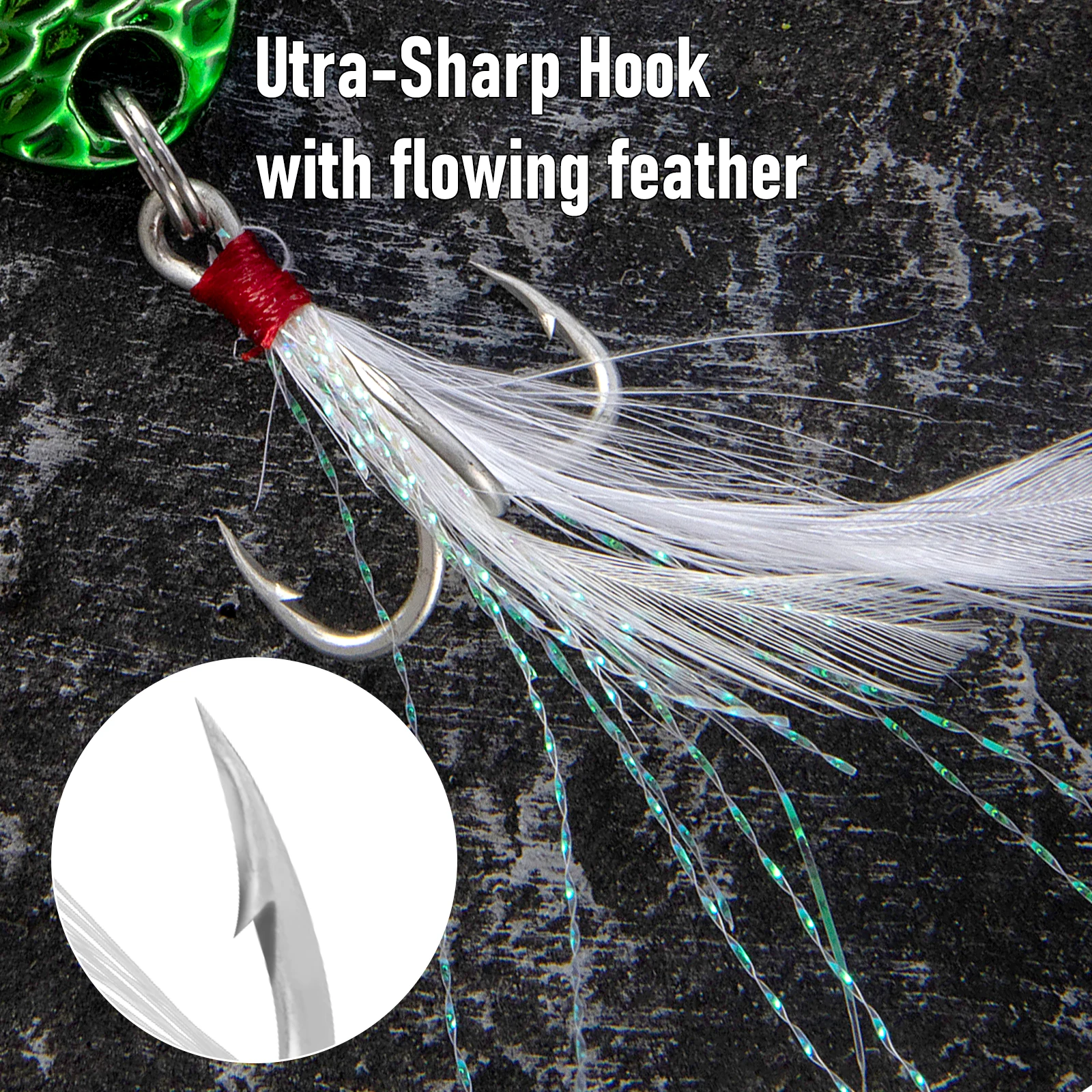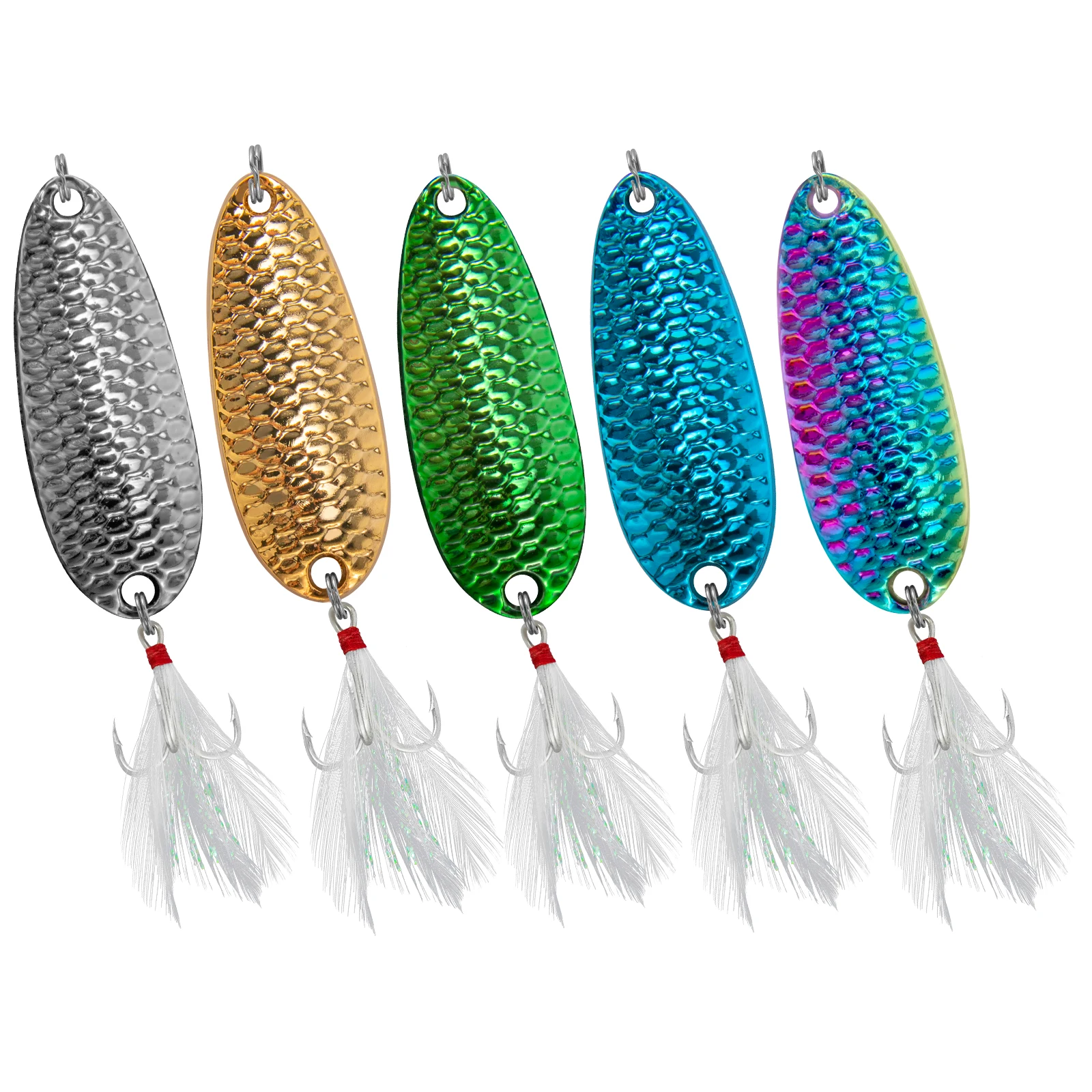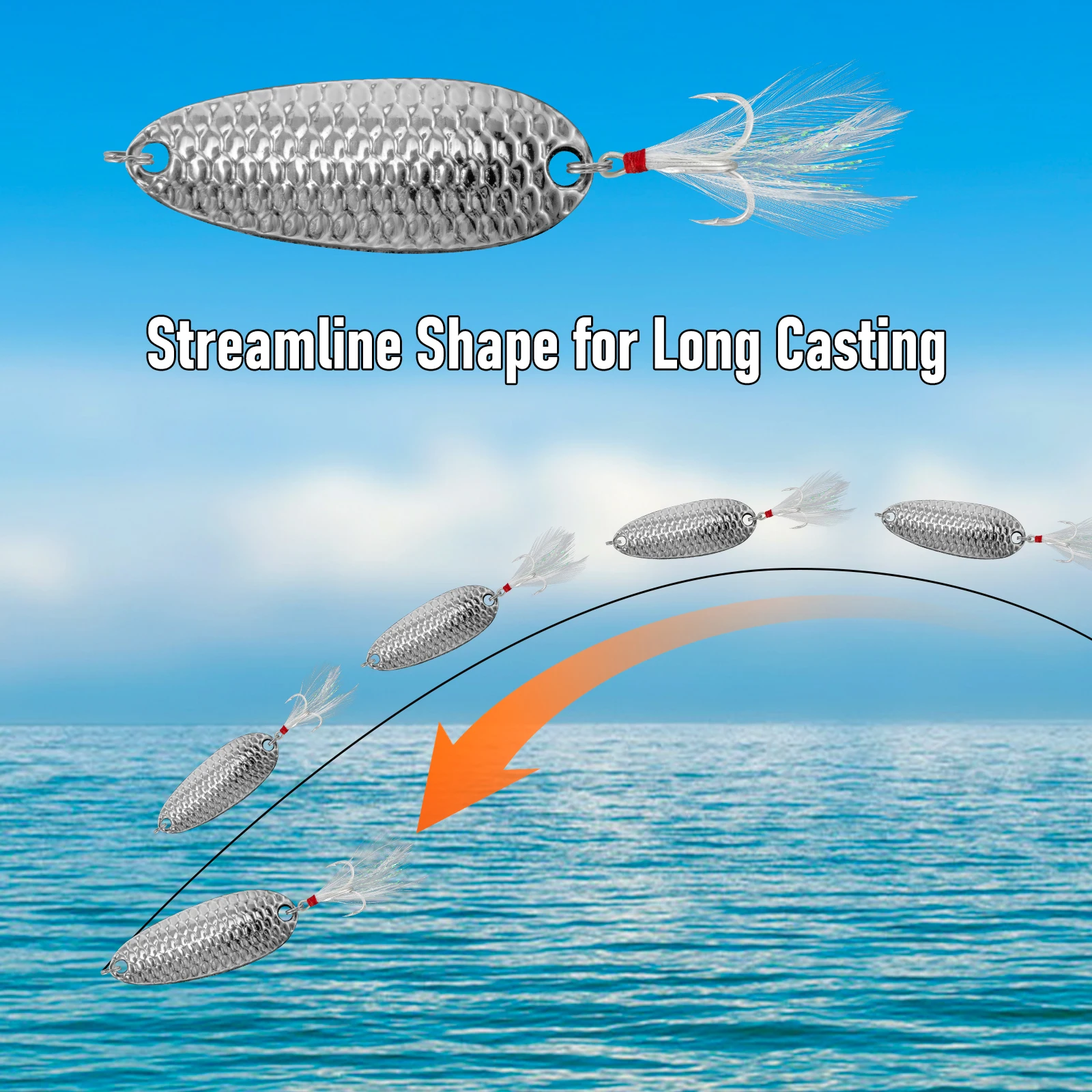 El diseño martillado ofrece destellos brillantes pronunciados en el agua, lo que maximiza el reflejo de la luz y atrae a los peces desde una distancia mayor.