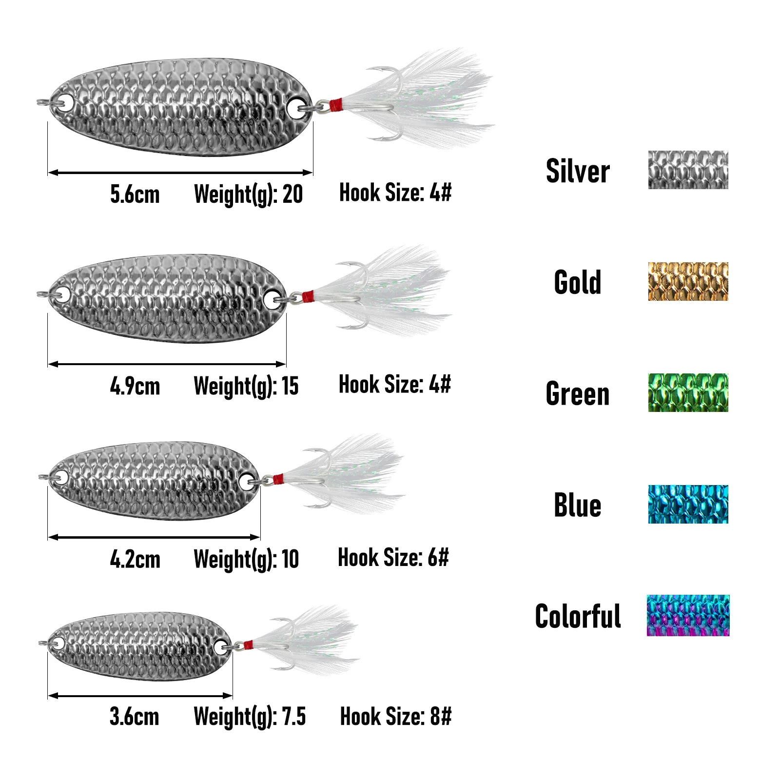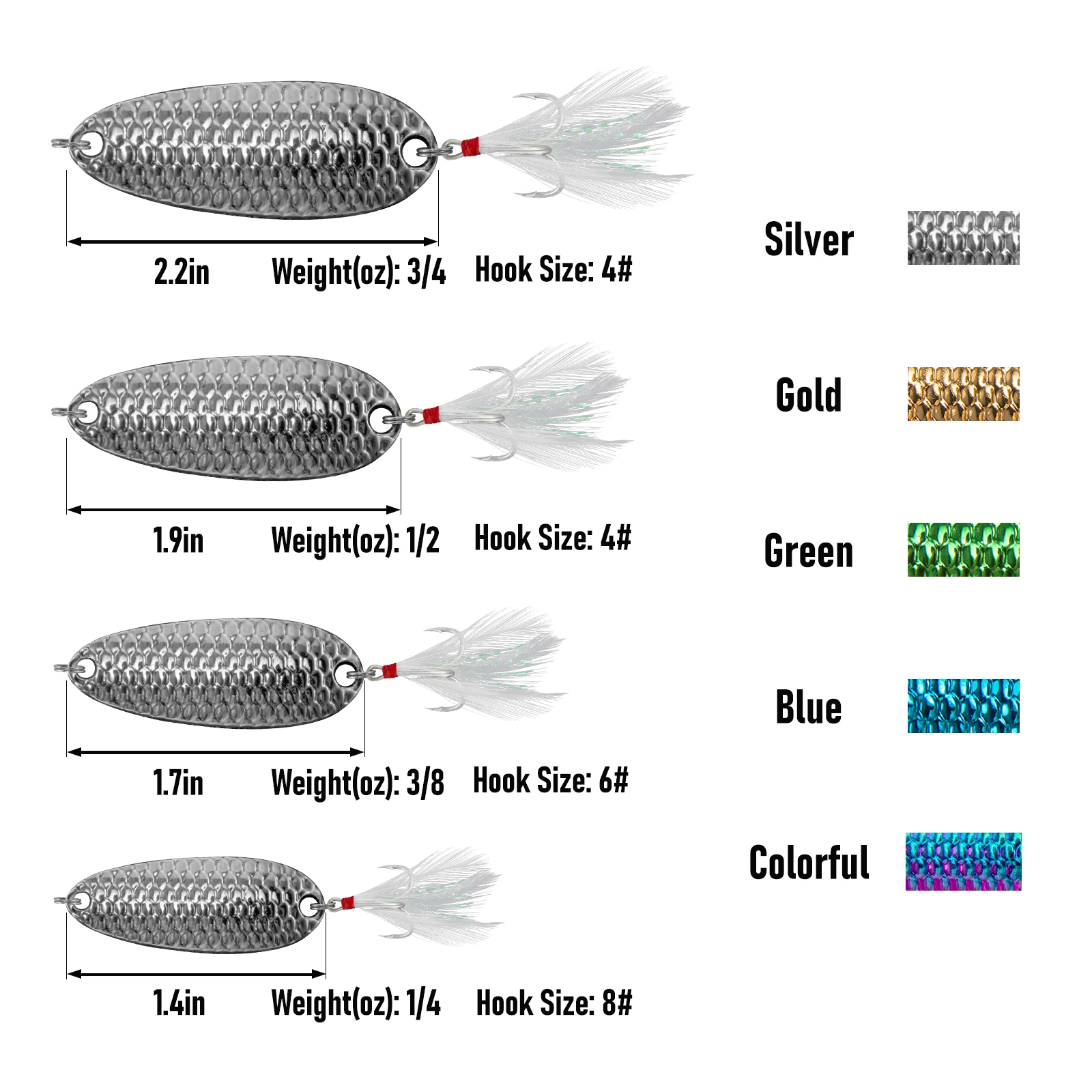 Ampliamente aplicable: lubina, trucha, caballa, bagre, etc. Peso: 1/4oz, 3/8oz,1/2oz, 3/4oz. Tamaño del gancho: #4,#6,#8