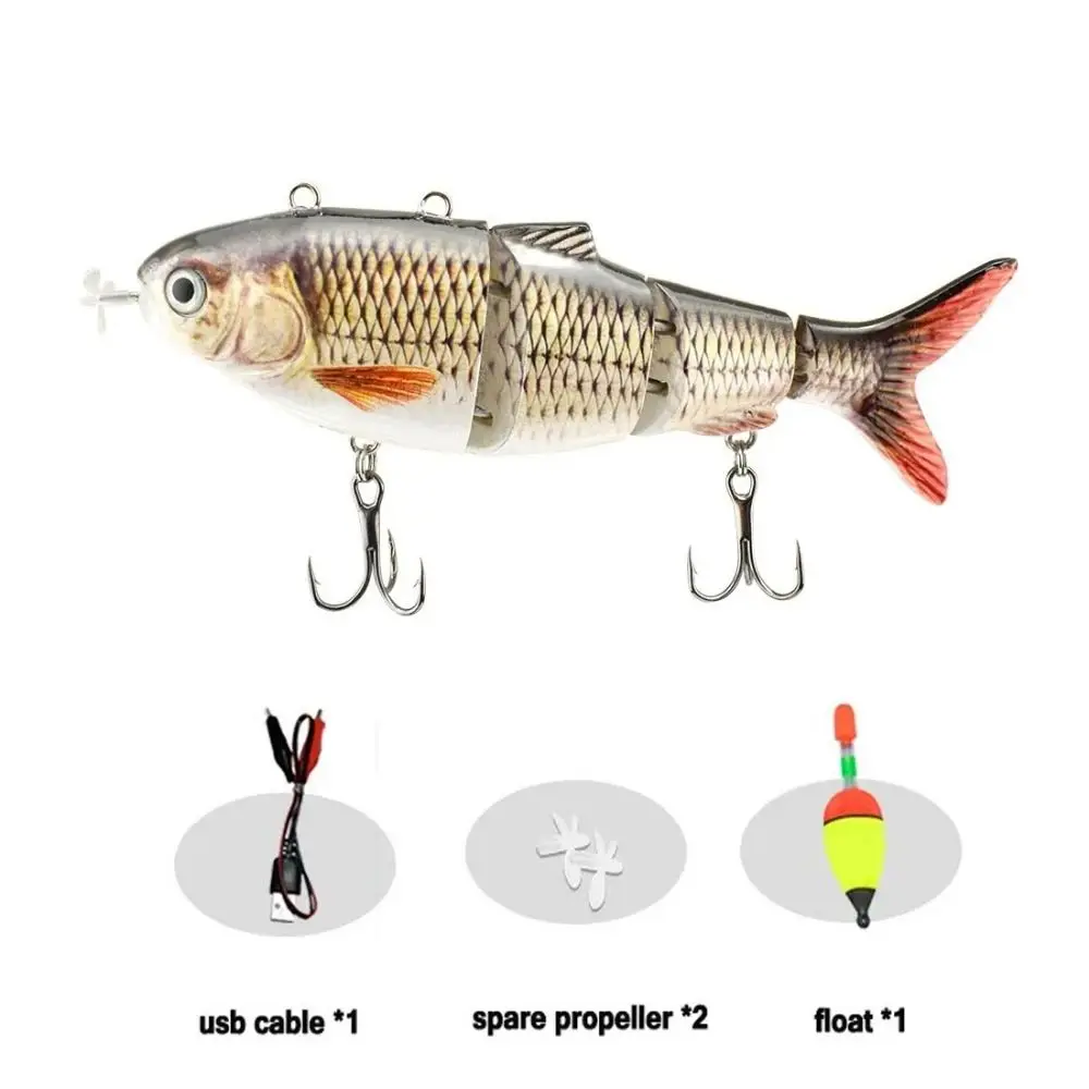 package includes:1pcs Auto-Swimming Lures.1pcs Plastic Box,1pcs USB Charge Cable,1pcs Fisbing Float,2pcs Propeller Lifelike Fishing Lures - Equipped with 3D realistic looking eyes and pearl powder coating, this fishing lures brilliantly replicates bright sharp color and patterns of actual bait fish.