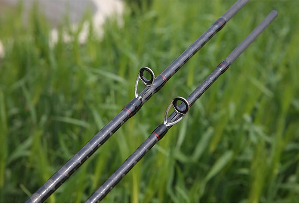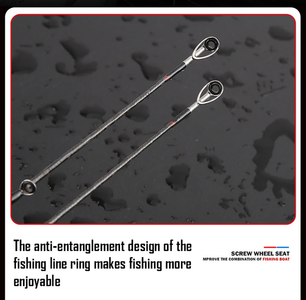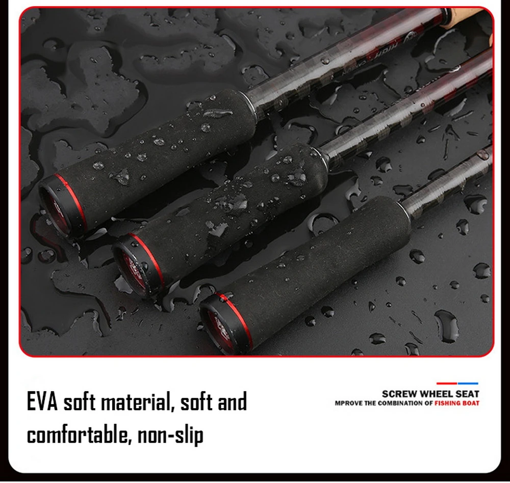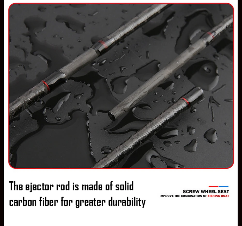 Material: fibra de carbono de alta densidad, el proceso de bobinado cruzado de tela de fibra de carbono de alta densidad hace que la varilla sea más fuerte y más antitorsión, Y la caña no es fácil de romper al pescar peces grandes