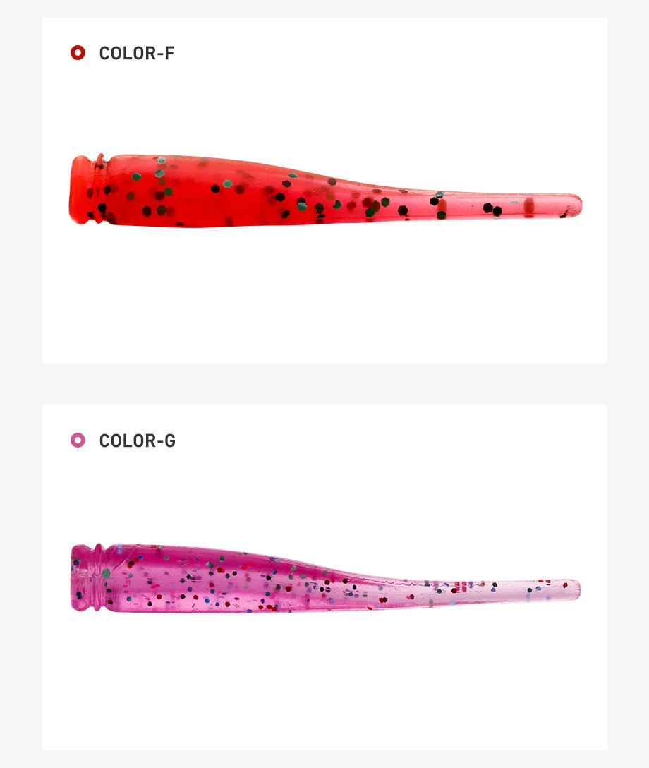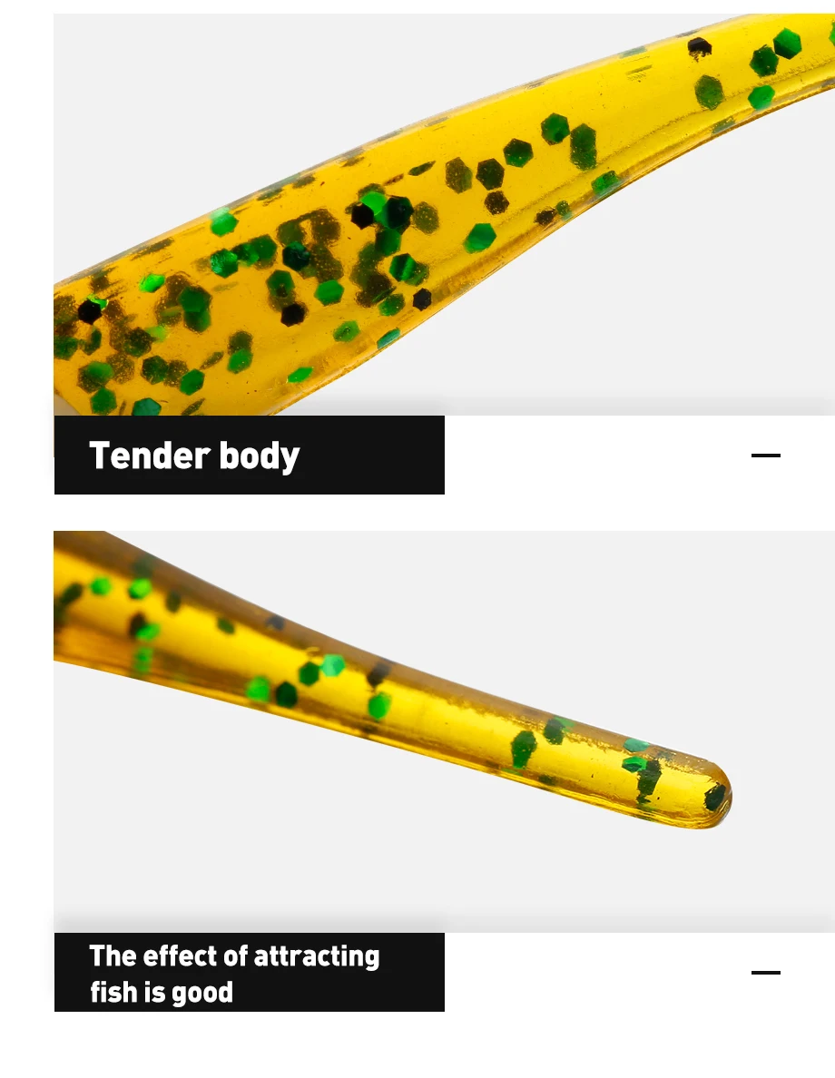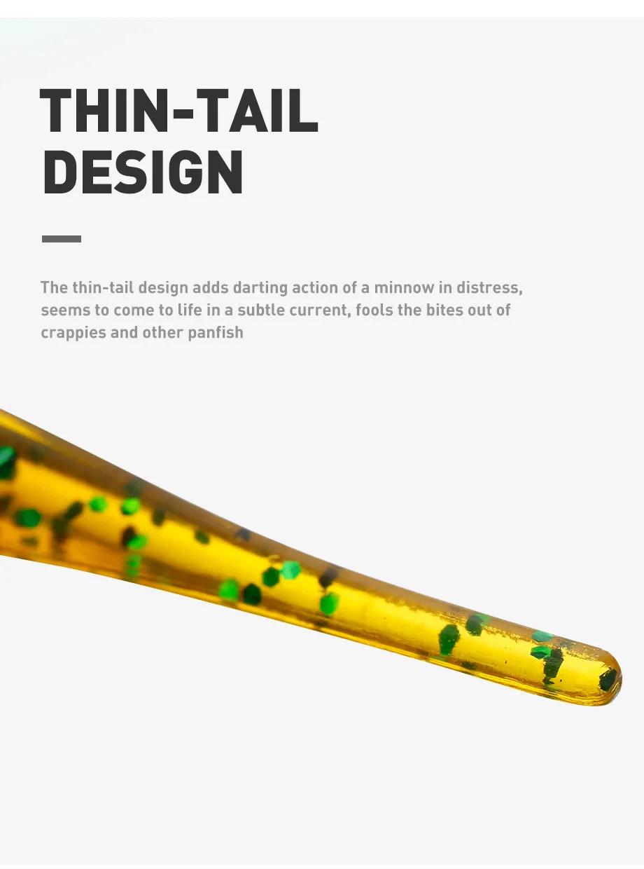 Diseño de cola delgada: el diseño de cola delgada agrega la acción de lanzamiento de un pececillo en apuros, parece cobrar vida en una corriente sutil, se burla de los bocados de crappies y otros peces Súper suaves y elásticos. Dura muchas veces más que otros plásticos