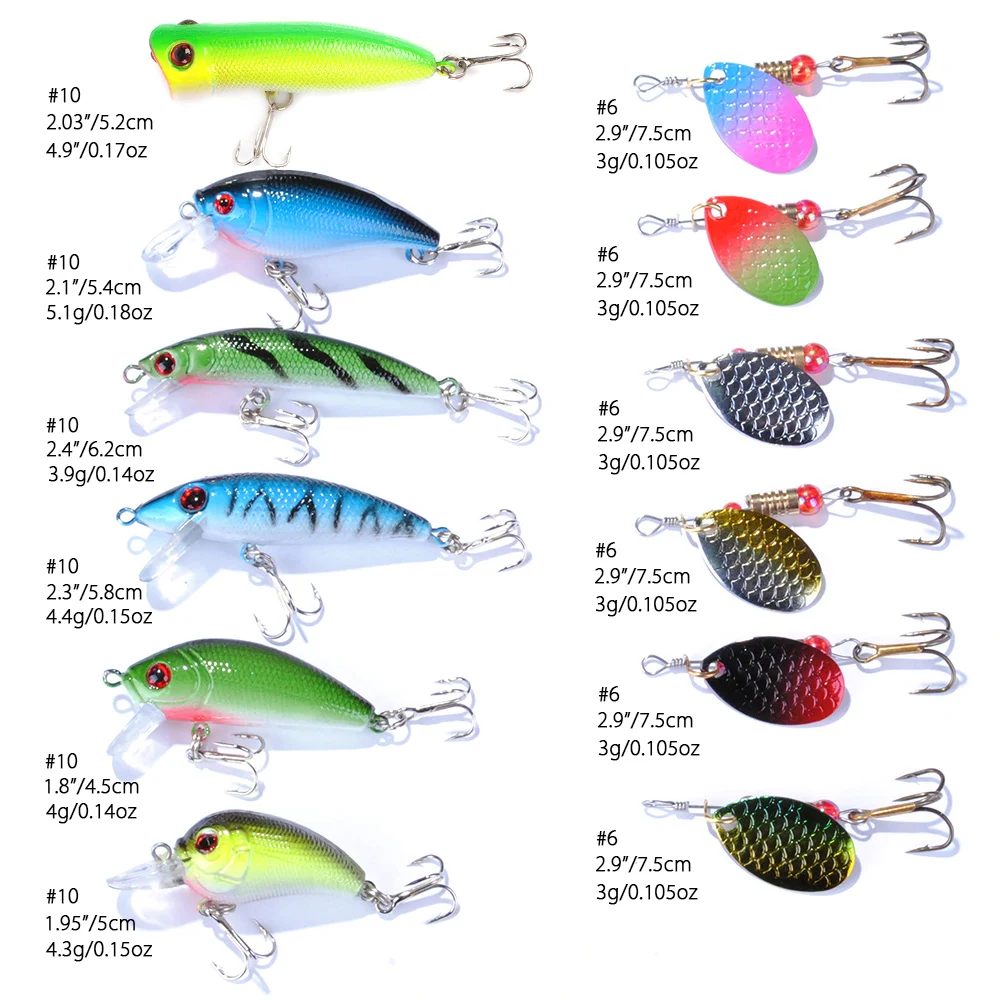 Multiusos:La diversidad de este kit de Señuelos de Pesca le permite apuntar a muchas especies diferentes de peces en muchas circunstancias diferentes con solo nuestro kit. Puede usar este kit para lubina, trucha, lucioperca, panfish, perca, salmón o Lucio. Y puede usarlos tanto para la pesca de agua dulce como salada en diferentes situaciones de agua.