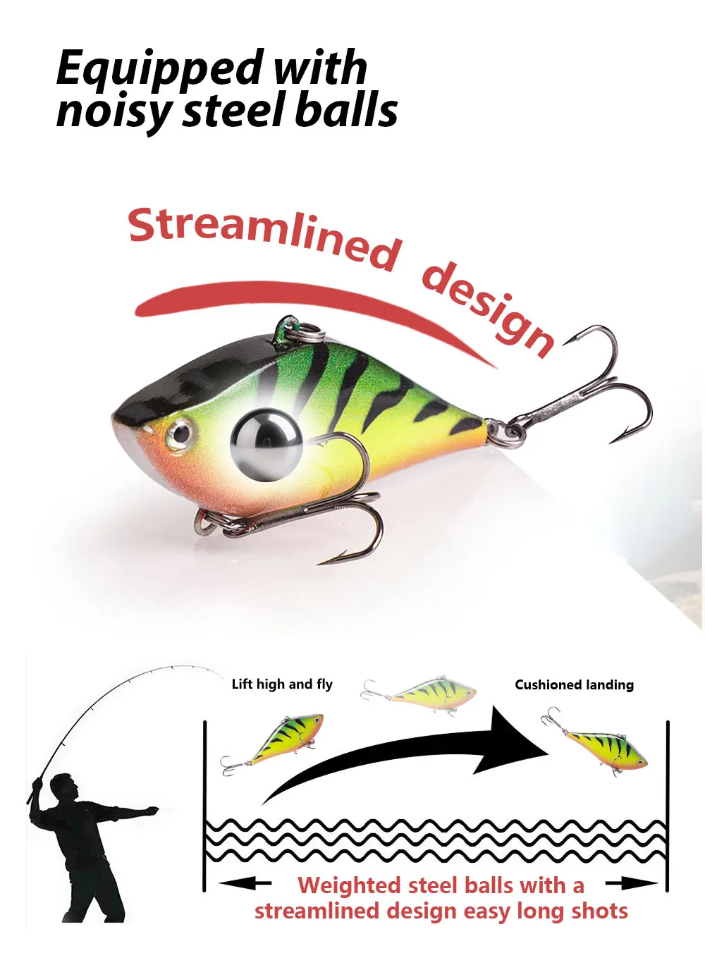 La acción de natación perfecta es mortalmente atractiva para los peces. Este tipo de señuelo de pesca muestra una acción de natación animada en el agua. Con una bola de acero en el interior, los cebos pueden permanecer estables durante el lanzamiento y pueden aumentar la distancia de lanzamiento al mismo tiempo.