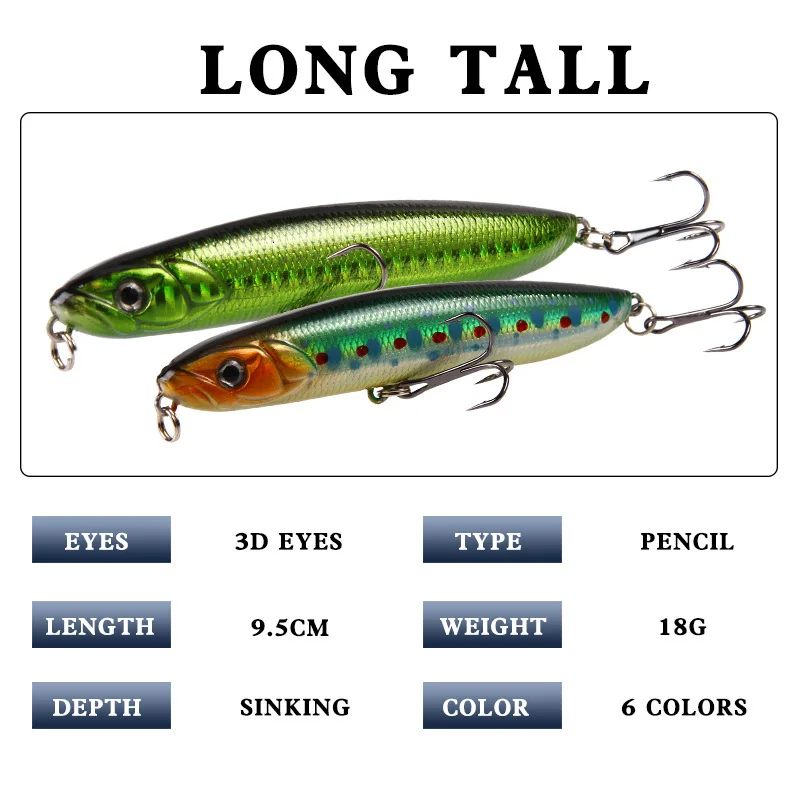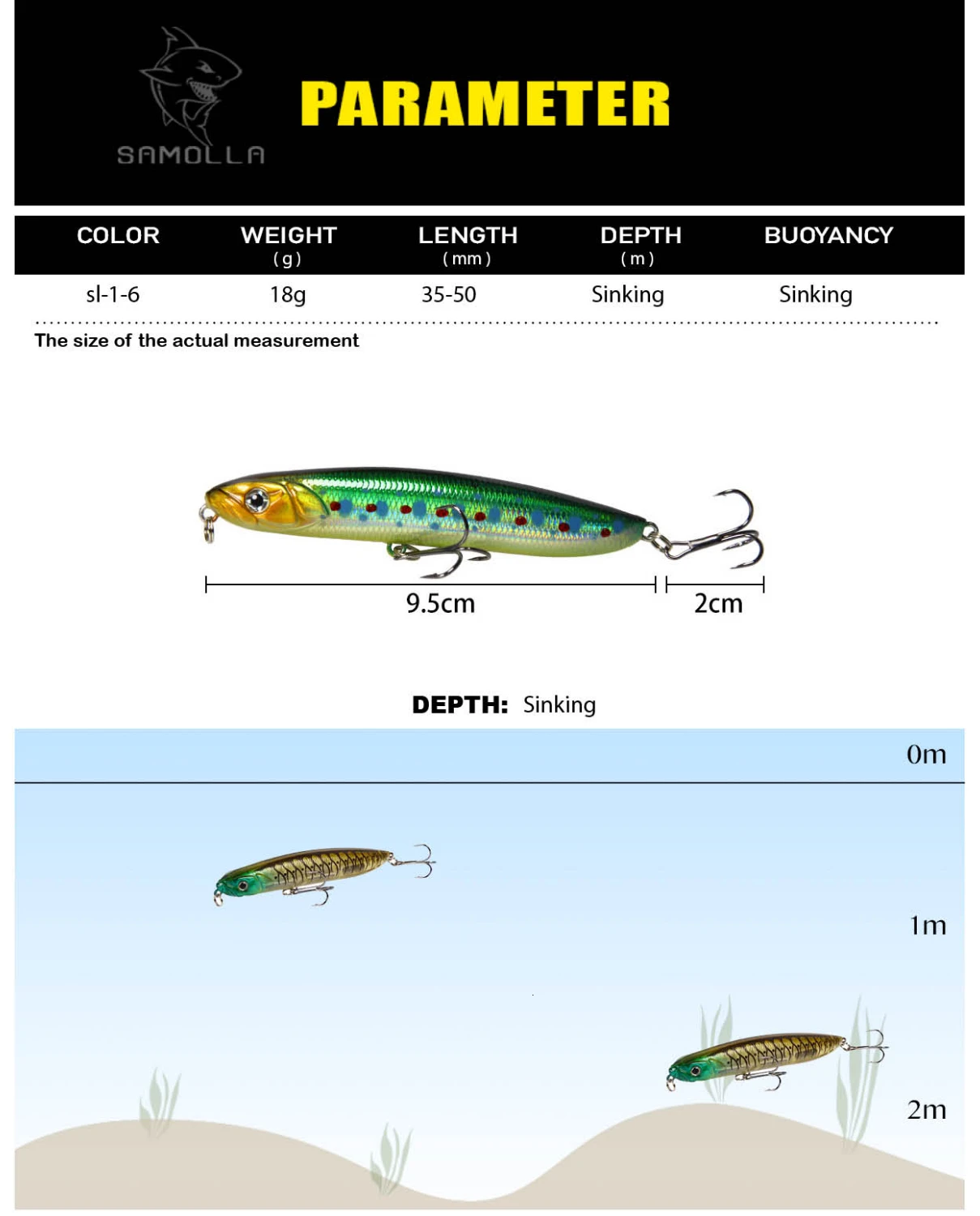 Detalles del producto: Marca: SAMOLLA Modelo de señuelo: señuelo de lápiz Tipo de señuelo: señuelo de pesca duro Peso del señuelo: 18g Longitud del señuelo: 35-50mm Profundidad de buceo: capa de agua completa Flotabilidad: hundimiento Ganchos: Equipado con ganchos anticorrosión de Ojos: ojos de pez 3D Anillos: bicíclicos Colores: 6 colores