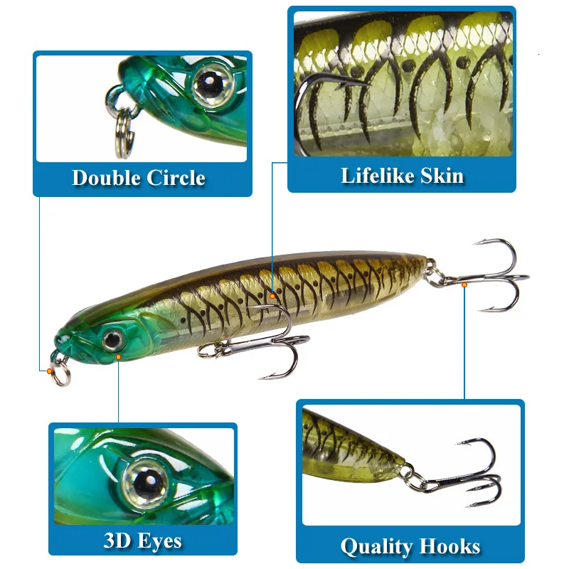 Características del producto: 1. El cuerpo del cebo adopta materiales avanzados de protección ambiental, no solo tiene una alta resistencia al impacto, sino que tampoco produce sustancias nocivas para el medio ambiente. 2. El cebo está diseñado para tener el mejor equilibrio para que el cebo pueda nadar a la velocidad de recuperación más lenta posible. 3. Los cebos tienen pintura realista y ojos 3D vívidos, hacen que el cebo parezca un pez real nadando en el agua durante la pesca. 4. Cuerpo colorido: Diseño de simulación, más atractivo para los peces. 5. Ganchos: anticorrosión, potencia más fuerte, duradero, agua de mar dulce universal. 6. Bolas de metal: Bolas de acero inoxidable en el interior, para mantener el equilibrio del señuelo de pesca, para la mayor distancia de lanzamiento. 7. Anillos bicíclicos más fuertes: fortalece el círculo doble y aumenta la resistencia a la tracción. 8. Simulación de piel de pez (láser): el diseño de simulación de piel de pez la hace más atractiva para los peces grandes. 9. A diferencia de la popular vinculación de ahorro realizada por empresas populares. Bearking utiliza un proceso detallado que requiere mucho tiempo. 10. El acabado del borde y el proceso de desbarbado de precisión reducen el área apareada áspera de los señuelos a una superficie lisa. 11. Para probar la integridad de la adhesión, los señuelos se prueban con agua, sumergidos en agua caliente que supera los 70 grados durante unos 20 segundos.