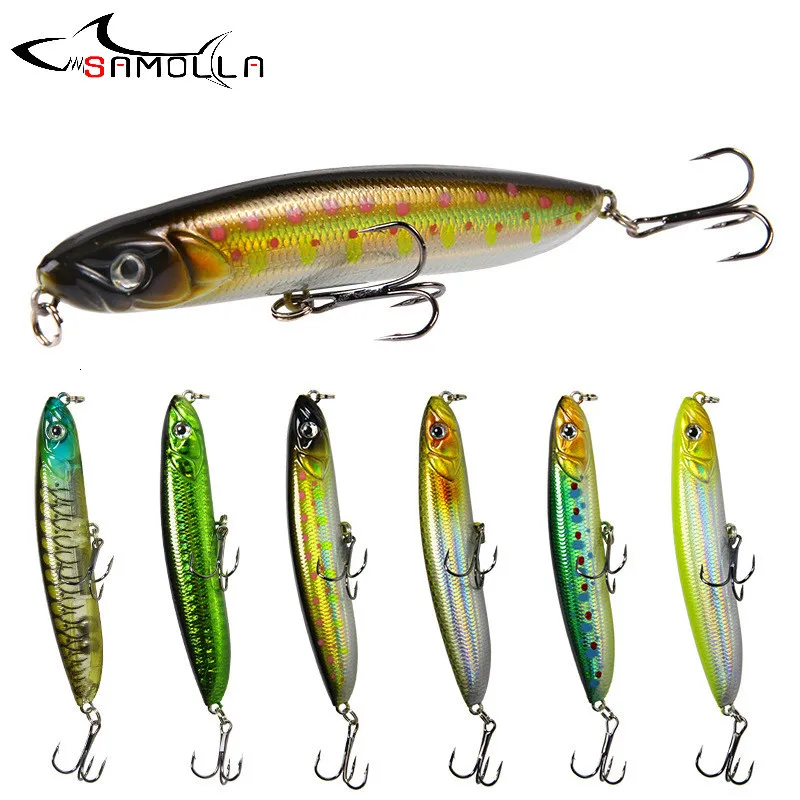 Detalles del producto: Marca: SAMOLLA Modelo de señuelo: señuelo de lápiz Tipo de señuelo: señuelo de pesca duro Peso del señuelo: 18g Longitud del señuelo: 35-50mm Profundidad de buceo: capa de agua completa Flotabilidad: hundimiento Ganchos: Equipado con ganchos anticorrosión de Ojos: ojos de pez 3D Anillos: bicíclicos Colores: 6 colores