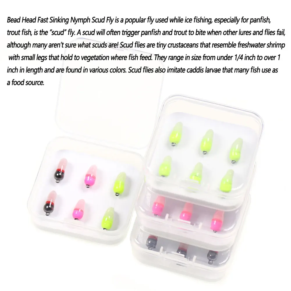 ---- Bead Head Fast Sinking Nymph Scud Fly es una mosca popular utilizada durante la pesca en hielo, especialmente para el panfish, el pez trucha, es la mosca "Scud". Un Scud a menudo provocará que el panfish y la trucha muerdan cuando otros señuelos y moscas fallan, ¡aunque muchos no están seguros de qué son los scuds! Las moscas Scud son pequeños crustáceos que se parecen a los camarones de agua dulce con patas pequeñas que se sujetan a la vegetación donde se alimentan los peces. Varían en tamaño desde menos de 1/4 pulgadas hasta más de 1 pulgada de longitud y se encuentran en varios colores. Las moscas Scud también imitan las larvas caddis que muchos peces usan como fuente de alimento.