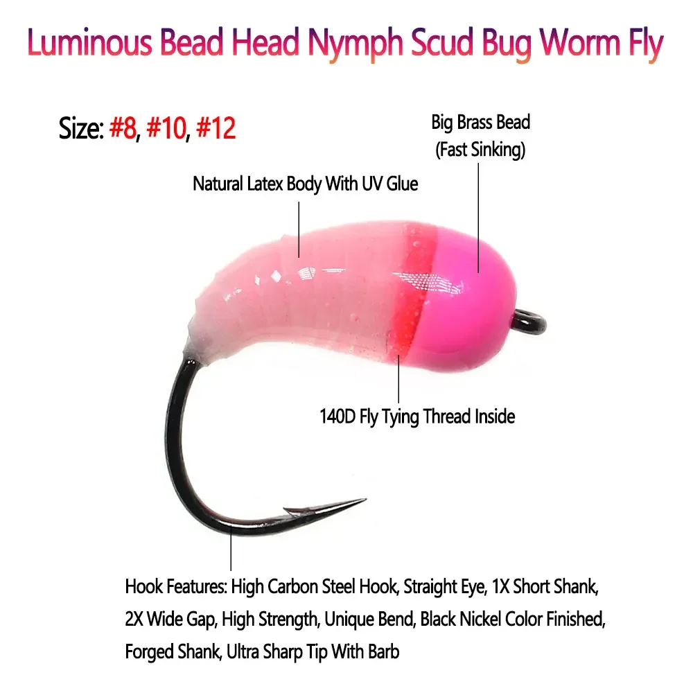 6-Cabeza de Cuentas de Latón Luminoso, Señuelos de Pesca en Hielo, Ninfa, Scud Bug, Gusano, Mosca, Caddis, Larvas, Insectos, Trucha, #8, #10, #12