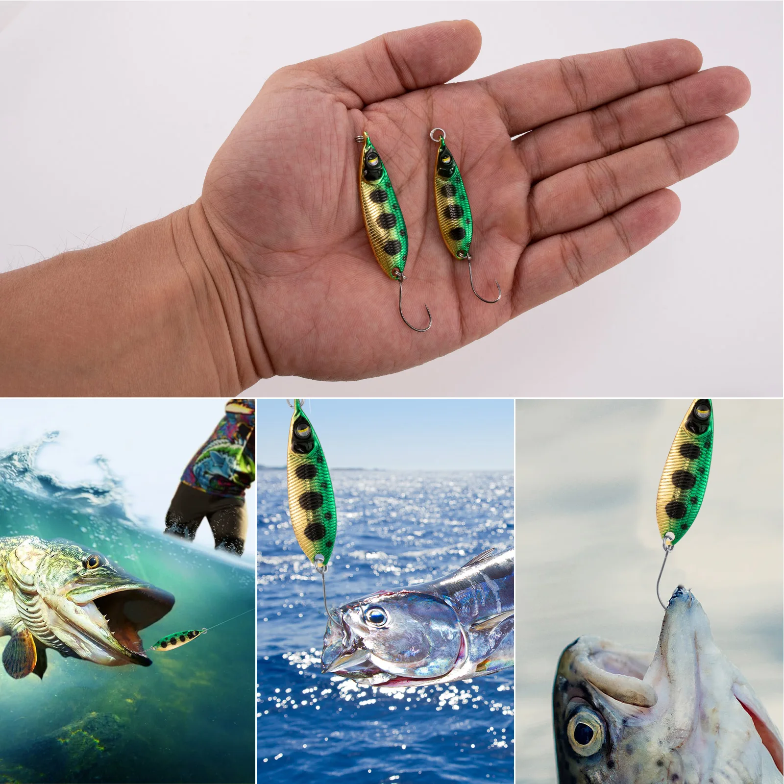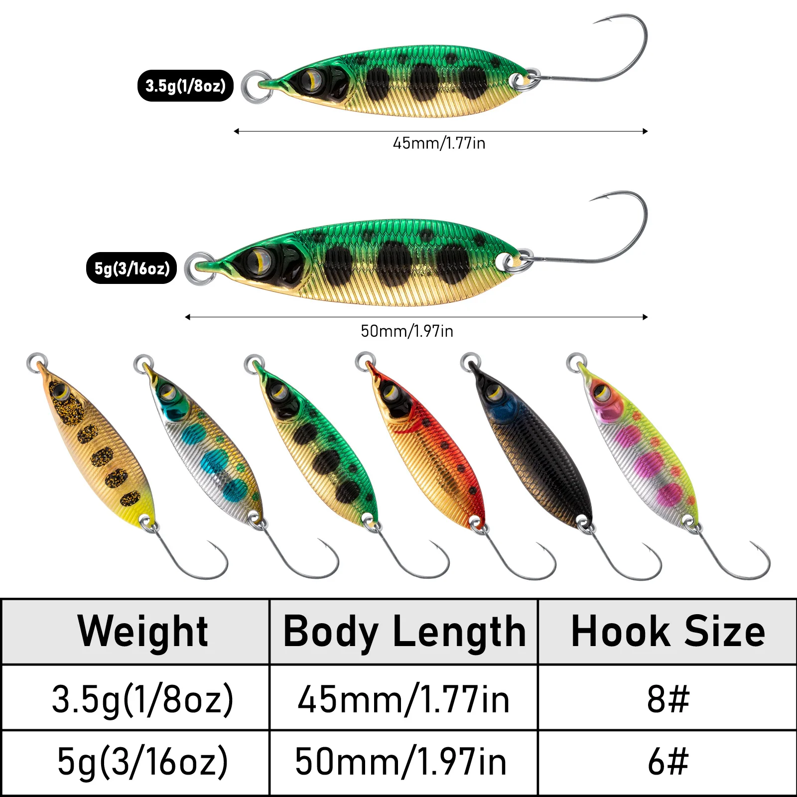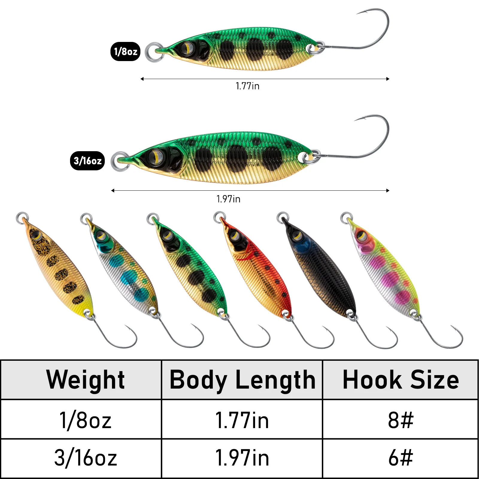 Ampliamente aplicable: Peso: 1/8oz,3/16oz, tamaño del gancho: #8,#6. Este Kit de cucharas de pesca le permite apuntar a muchas especies diferentes de peces en muchas circunstancias diferentes, se cree que estos serán los señuelos indispensables en su bolsa de aparejos.